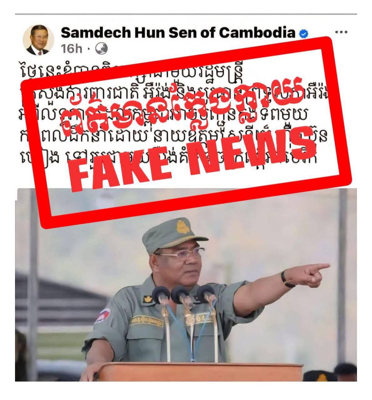 ឯកឧត្តម ជា ធីរិទ្ធ អ្នកនាំពាក្យសម្ដេចតេជោ សូមជម្រាបជូនសាធារណជនជ្រាបថា ព័ត៌មានខាងលើនេះ ជាព័ត៌មានក្លែងក្លាយ បង្កើតឡើងដោយពួកក្រុមជ្រុលនិយម ដែលមានបំណងមួលបង្កាត់ និងបង្ខូចកេរ្តិ៍ឈ្មោះសម្តេចតេជោ ក្នុងចេតនាញុះញង់ បង្កឲ្យមានចលាចលក្នុងសង្គម។