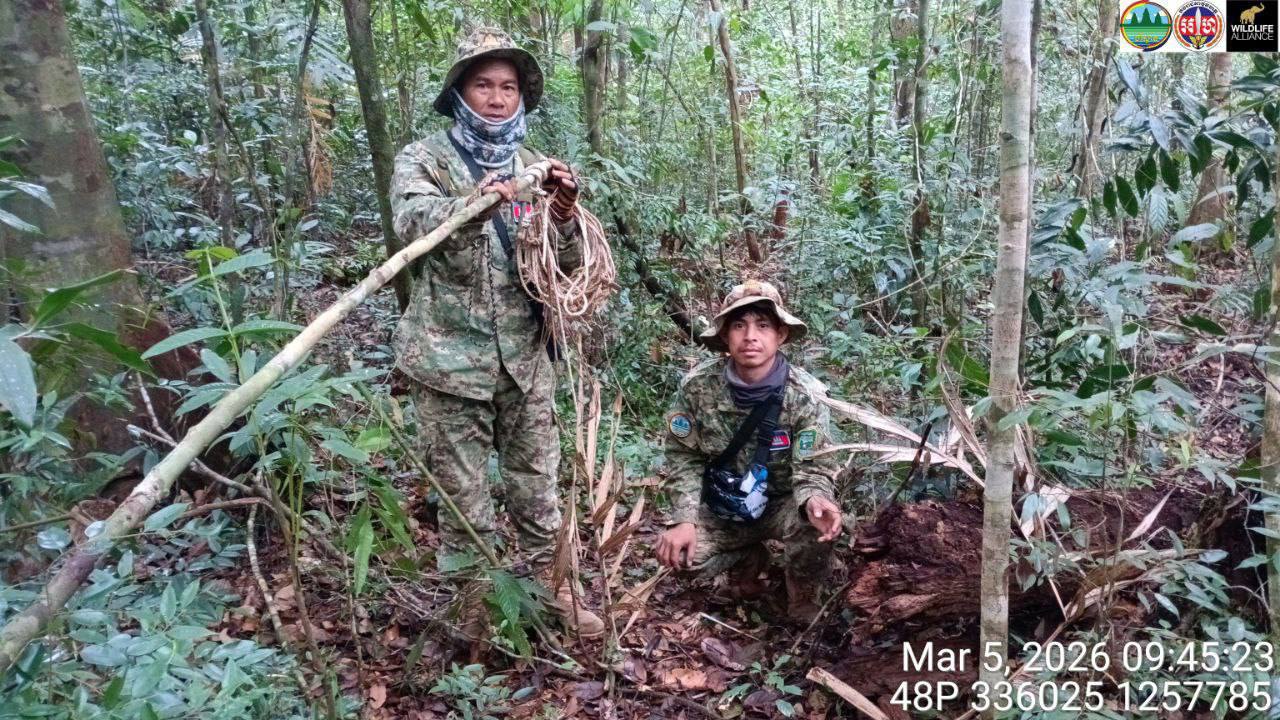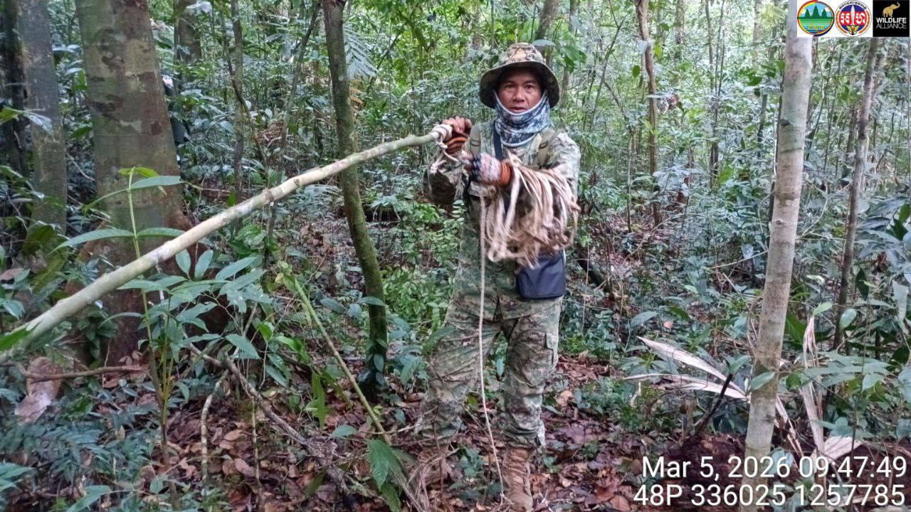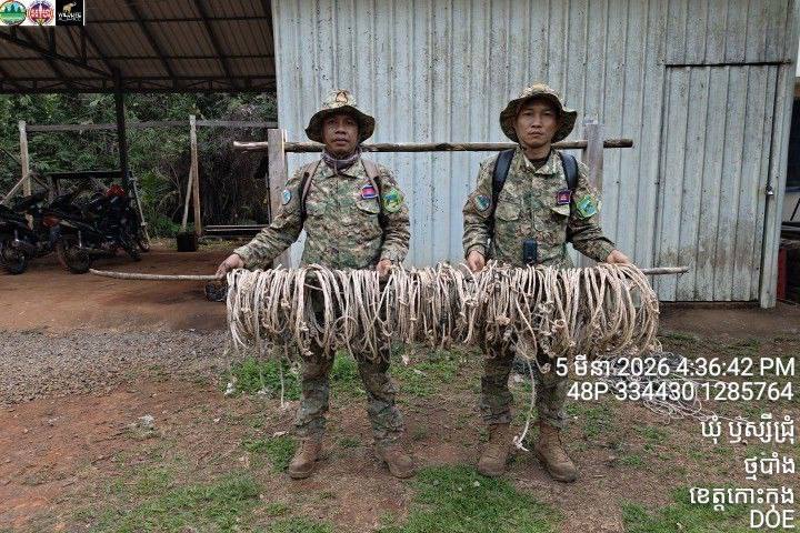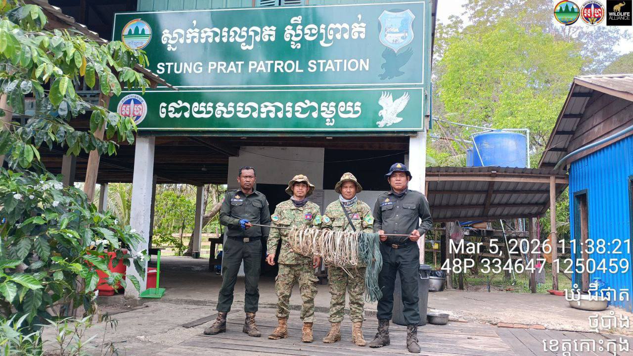 (កោះកុង)៖ ការដាក់អន្ទាក់ចាប់សត្វព្រៃ នៅតែជាការគំរាមកំហែងដ៏គួរឱ្យព្រួយបារម្ភមួយសម្រាប់អាយុជីវិតសត្វព្រៃនៅតាមឧទ្យានជាតិនានាក្នុងខេត្តកោះកុង។ ដើម្បីការពារអាយុជីវិតសត្វព្រៃរួចផុតពីអន្ទាក់របស់ជនខិលខូច មន្ត្រីឧទ្យានុរក្ស កងរាជអាវុធហត្ថខេត្តកោះកុង ក្រោមការគាំទ្រពីអង្គការសម្ព័ន្ធមិត្តសត្វព្រៃ បានចុះល្បាត និងទប់ស្កាត់បទល្មើសជាប់ជាប្រចាំ។