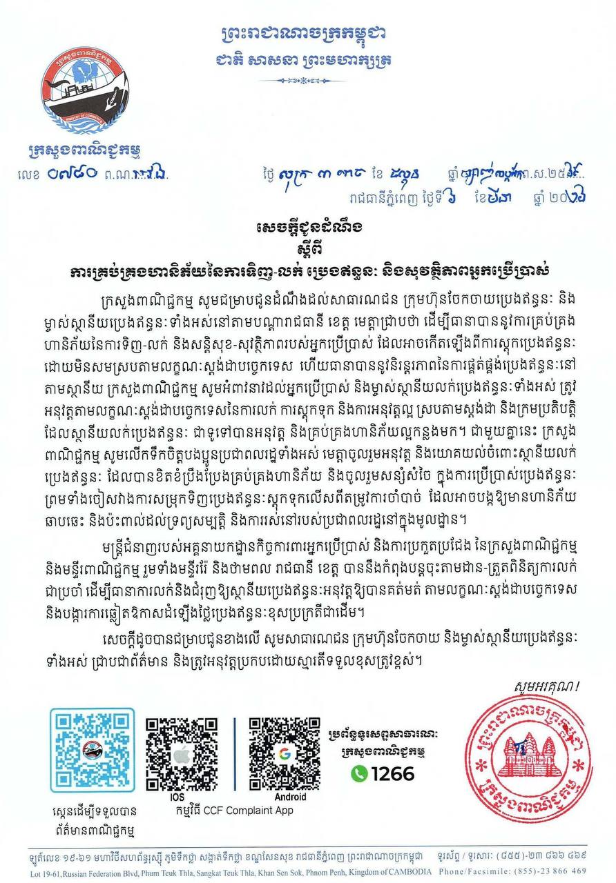 សេចក្តីជូនដំណឹង ស្ដីពី ការគ្រប់គ្រងហានិភ័យនៃការទិញ-លក់ ប្រេងឥន្ធនៈ និងសុវត្ថិភាពអ្នកប្រើប្រាស់ On Mar 6, 2026 សេចក្តីជូនដំណឹង ស្ដីពី ការគ្រប់គ្រងហានិភ័យនៃការទិញ-លក់ ប្រេងឥន្ធនៈ និងសុវត្ថិភាពអ្នកប្រើប្រាស់