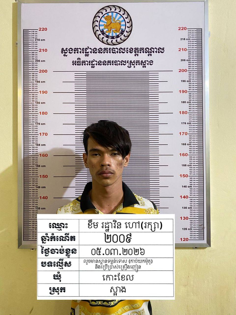 (កណ្ដាល)៖ ដោយអនុវត្តតាមបទបញ្ជាដឹកនាំរបស់នាយឧត្តមសេនីយ៍ ស ថេត អគ្គស្នងការនគរបាលជាតិ និងលោក គួច ចំរើន អភិបាលខេត្តកណ្តាល លោកឧត្តមសេនីយ៍ទោ ឈឿន សុចិត្ត ស្នងការនគរបាលខេត្តកណ្តាល បានបញ្ជាដល់កម្លាំងជំនាញរបស់ស្នងការដ្ឋានរួមជាមួយកម្លាំងអធិការដ្ឋាននគរបាលក្រុងតាខ្មៅ ស្រុកស្អាង និងស្រុកកណ្តាលស្ទឹង បានធ្វើការស្រាវជ្រាវបង្ក្រាបមុខសញ្ញា ធាក់ប្លន់ប្រជាពលរដ្ឋនៅពេលយប់ក្នុងភូមិសាស្ដ្រខេត្តកណ្ដាល។