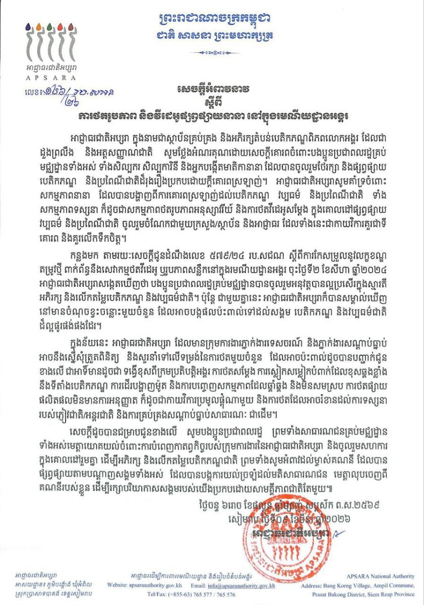 អាជ្ញាធរជាតិអប្សរាបានឱ្យដឹងថា កន្លងមក តាមរយៈសេចក្តីជូនដំណឹងលេខ ៥៧៩/២៤ រប.សជណ ស្តីពីការកែសម្រួលនូវលក្ខខណ្ឌ តម្រូវថ្មី ពាក់ព័ន្ធនឹងសេវាកម្មថតវីដេអូ ឬរូបភាពសន្លឹកនៅក្នុងរមណីយដ្ឋានអង្គរ ចុះថ្ងៃទី២ ខែសីហា ឆ្នាំ២០២៤ អាជ្ញាធរជាតិអប្សរាសង្កេតឃើញថា បងប្អូនប្រជាពលរដ្ឋគ្រប់មជ្ឈដ្ឋានបានចូលរួមអនុវត្តបានល្អប្រសើរក្នុងស្មារតី អភិរក្ស និងលើកតម្លៃបេតិកភណ្ឌ និងវប្បធម៌ជាតិ។ ប៉ុន្តែ ជាមួយគ្នានេះ អាជ្ញាធរជាតិអប្សរាក៏បានសម្គាល់ឃើញ នៅមានចំណុចខ្វះចន្លោះមួយចំនួន ដែលអាចបង្កផលប៉ះពាល់ទៅដល់សង្គម បេតិកភណ្ឌ និងវប្បធម៌ជាតិ ដ៏ល្អផូរផង់ផងដែរ។