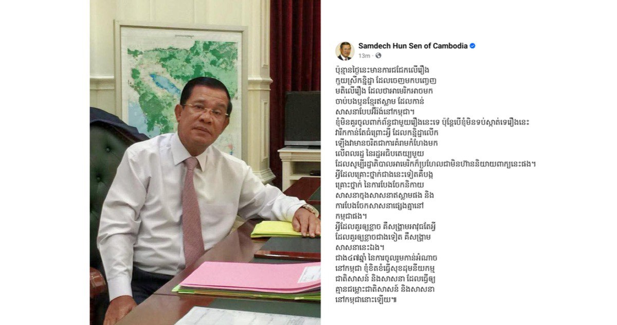 សម្តេចអគ្គមហាសេនាបតីតេជោ ហ៊ុន សែន បានសរសេរលើបណ្តាញសង្គមការងារផ្លូវការ នាល្ងាចថ្ងៃទី១១ ខែមីនាឆ្នាំ២០២៦នេះថា ប៉ុន្មានថ្ងៃនេះមានការជជែកលើរឿង ក្មួយស្រីកន្និដ្ឋា ដែលចេញមកបញ្ចេញ មតិលើរឿង ដែលថាអាមេរិកអាចមក ចាប់បងប្អូនខ្មែរឥស្លាម ដែលកាន់ សាសនាបែបអ៊ីរ៉ង់នៅកម្ពុជា។