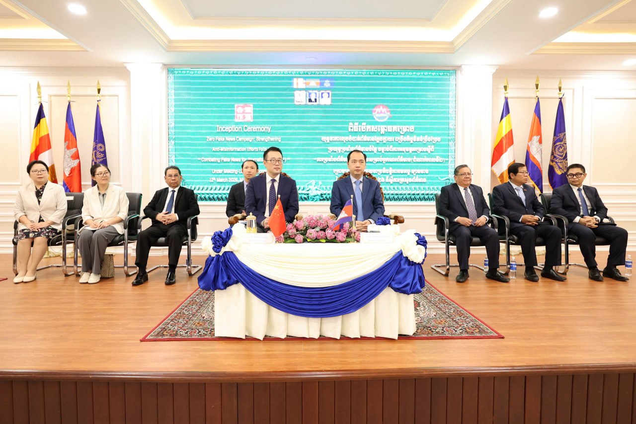 ឯកឧត្តម នេត្រ ភក្ត្រា រដ្ឋមន្ត្រីក្រសួងព័ត៌មាន និងឯកឧត្តម Chen Cong អគ្គទីប្រឹក្សា ស្ថានទូតសាធារណរដ្ឋប្រជាមានិតចិនប្រចាំព្រះរាជាណាចក្រកម្ពុជា អញ្ជើញជាអធិបតីពិធីសម្ពោធការអនុវត្តគម្រោងមេគង្គ-ឡានឆាង (Mekong-Lancang) របស់ក្រសួងព័ត៌មាន ស្តីពី យុទ្ធនាការលុបបំបាត់ព័ត៌មានក្លែងក្លាយ៖ ពង្រឹងកិច្ចខិតខំប្រឹងប្រែងប្រយុទ្ធប្រឆាំងព័ត៌មានបំភ្លៃ បន្ទាប់ពីការអនុវត្តគម្រោងស្តីពី «ការប្រឆាំងព័ត៌មានក្លែងក្លាយសម្រាប់អ្នកសារព័ត៌មាន (ដំណាក់កាលទី២) នៅសាលមណ្ឌលបណ្ដុះបណ្តាលវិក្រឹត្យការវិជ្ជាជីវៈសារព័ត៌មាន រាជធានីភ្នំពេញ នារសៀលថ្ងៃទី១២ ខែមីនា ឆ្នាំ២០២៦។