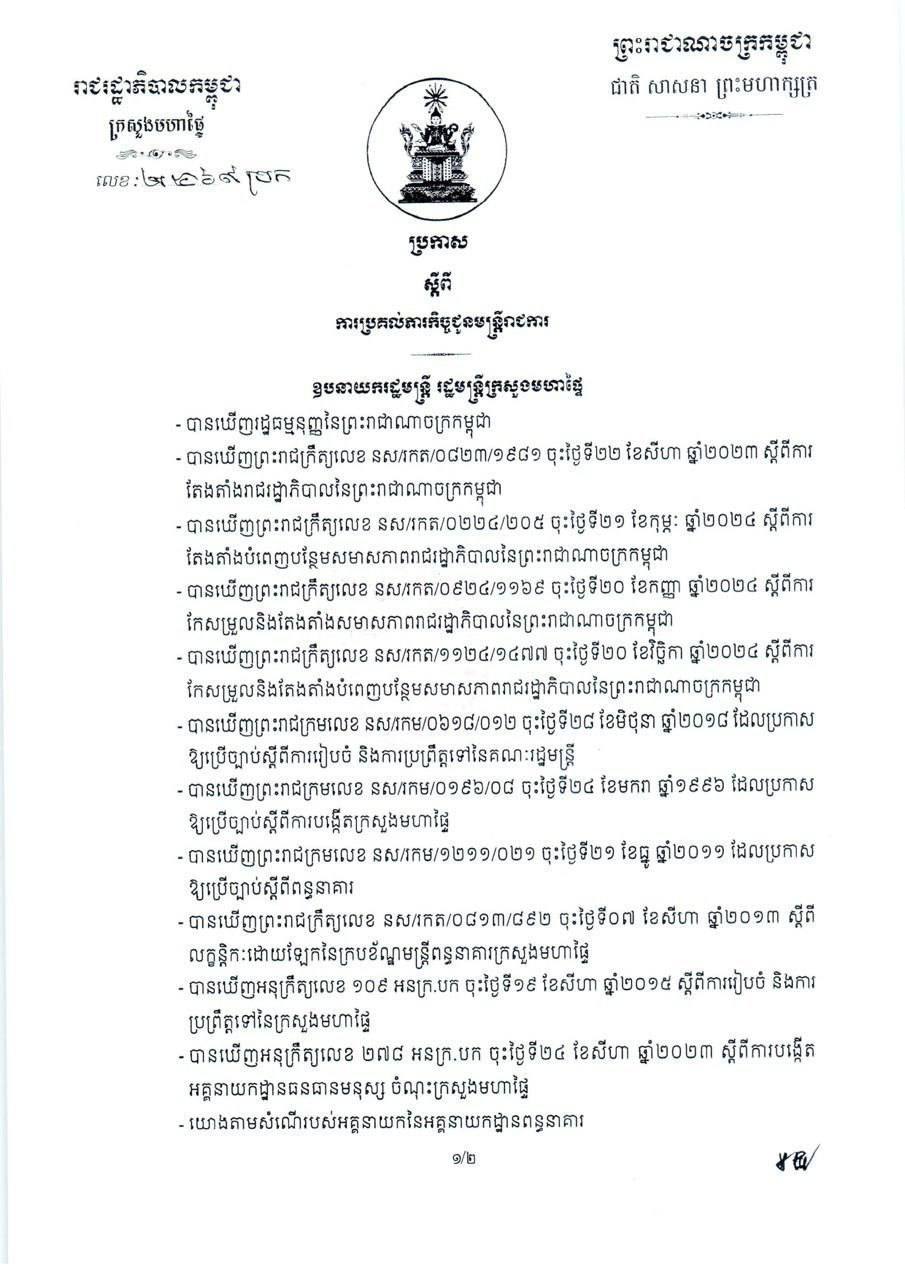 (ភ្នំពេញ)៖ លោកអភិសន្ដិបណ្ឌិត ស សុខា ឧបនាយករដ្ឋមន្ដ្រី រដ្ឋមន្ដ្រីក្រសួងមហាផ្ទៃ បានចេញប្រកាសតែងតាំង លោកឧត្តមអគ្គានុរក្សថ្នាក់លេខ៣ សំអុល តាំងប៊ុនណាត ជាប្រធានស្ដីទីពន្ធនាគារខេត្តស្ទឹងត្រែង។ នេះបើតាមប្រកាសដែលបណ្ដាញព័ត៌មាន ទទួលនៅថ្ងៃទី១៣ ខែមីនា ឆ្នាំ២០២៥។