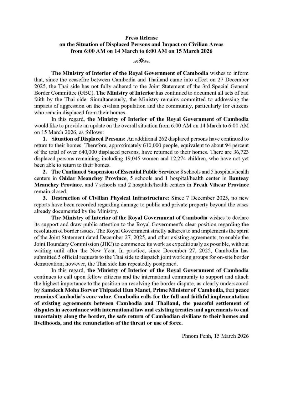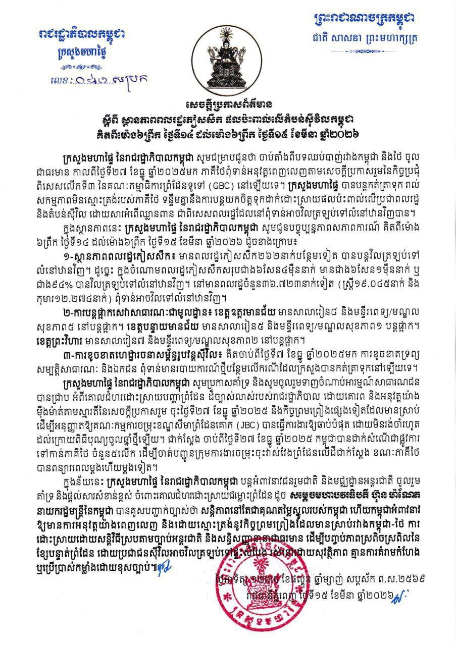 (ភ្នំពេញ)៖ ក្រសួងមហាផ្ទៃ បានបញ្ជាក់ថា គិតពីម៉ោង ៦ព្រឹក ថ្ងៃទី១៤ ដល់ម៉ោង៦ព្រឹក ថ្ងៃទី១៥ ខែមីនា ឆ្នាំ២០២៦ មានពលរដ្ឋភៀសសឹក២៦២នាក់បន្ថែមទៀត បានបន្តវិលត្រឡប់ទៅ លំនៅឋានវិញ។