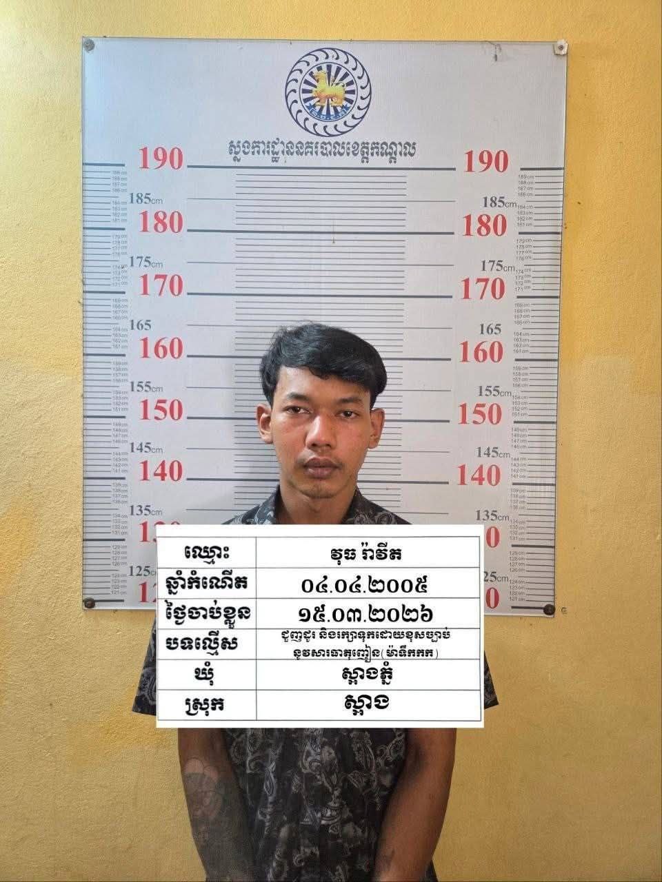 ខេត្តកណ្តាល ÷ សមត្ថកិច្ចបានឃាត់ខ្លួននិងវាយខ្នោះភ្លាមៗ ទៅលើជនសង្ស័យម្នាក់ដែលគ្រាន់តែសមត្ថកិច្ចក្រឡេកភ្នែកចំ មានអាកប្បកិរិយា ភិតភ័យតក់ស្លុត ពេលហៅសួរនាំឆែកឆេ ក៏រកឃើញគ្រឿងញៀនប្រភេទ មេតាំហ្វេតាមីន (ម៉ាទឹកកក)ចំនួន៥កញ្ចប់មធ្យមទម្ងន់ សរុប ៧២,៣២ក្រាម។ ហេតុការណ៍បានកើតឡើងកាលពី ថ្ងៃទី១៥ខែមីនាឆ្នាំ២០២៦ នៅចំណុចក្នុងភូមិដំរីឆ្លង ឃុំស្អាងភ្នំ ស្រុកស្អាង ខេត្តកណ្តាល ។