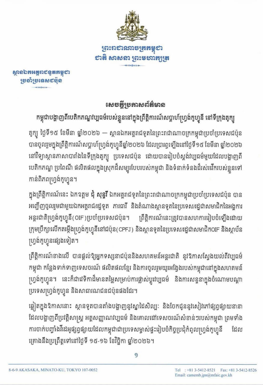 ស្ថានឯកអគ្គរាជទូតនៃព្រះរាជាណាចក្រកម្ពុជាប្រចាំប្រទេសជប៉ុន បានចូលរួមក្នុងព្រឹត្តិការណ៍សប្ដាហ៍ហ្វ្រង់កូហ្វូនីឆ្នាំ២០២៦ ដែលប្រារព្ធឡើងនៅថ្ងៃទី១៥ ខែមីនា ឆ្នាំ២០២៦ នៅវិទ្យាស្ថានភាសាបារាំងនៃទីក្រុងតូក្យូ ប្រទេសជប៉ុន ដោយបានរៀបចំស្តង់វប្បធម៌មួយដែលបង្ហាញពី បេតិកភណ្ឌ ប្រពៃណី ផលិតផលក្នុងស្រុកដ៏សម្បូរបែបរបស់កម្ពុជា និងទំនាក់ទំនងដ៏រស់រវើករបស់ខ្លួនទៅកាន់ពិភពហ្វ្រង់កូហ្វូន។