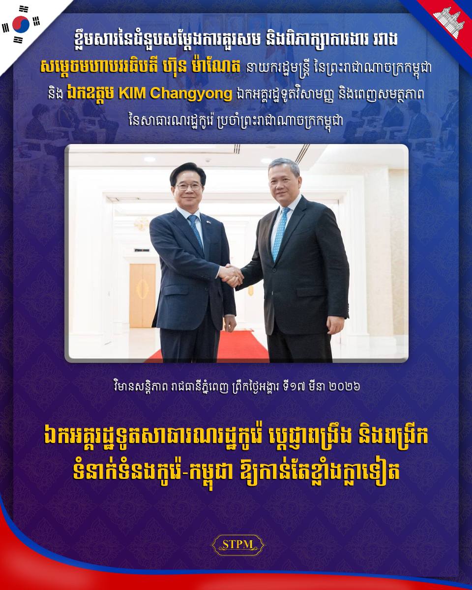 នាព្រឹកថ្ងៃទី១៧ ខែមីនា ឆ្នាំ២០២៦, សម្ដេចមហាបវរធិបតី ហ៊ុន ម៉ាណែត នាយករដ្ឋមន្ត្រី នៃព្រះរាជាណាចក្រកម្ពុជា បានអនុញ្ញាតឱ្យ ឯកឧត្តម គីម ឆាងយ៉ុង (KIM Chang Yong) ឯកអគ្គរដ្ឋទូតសាធារណរដ្ឋកូរ៉េ ប្រចាំព្រះរាជាណាចក្រកម្ពុជា ចូលជួបសម្ដែងការគួរសម និងពិភាក្សាការងារ នៅវិមានសន្ដិភាព។
