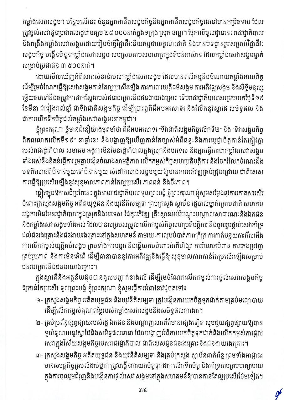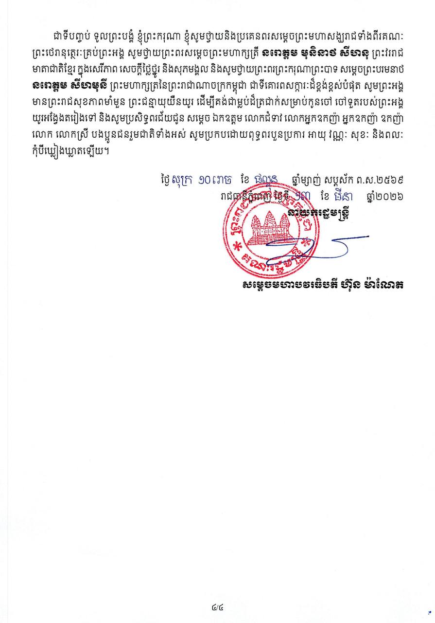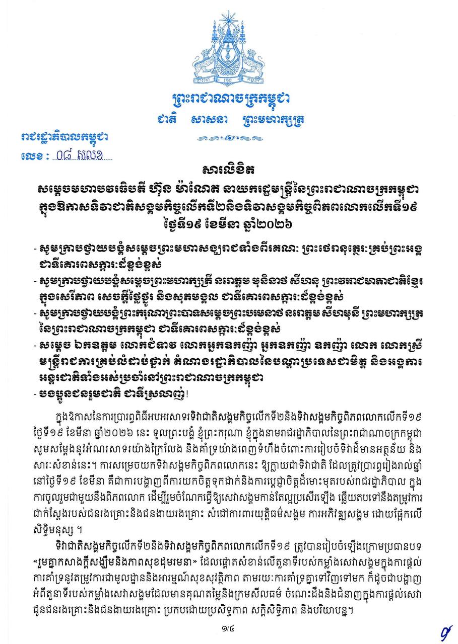 សម្តេចមហាបវរធិបតី ហ៊ុន ម៉ាណែត ចេញសារលិខិតអបអរសាទរ ក្នុងឱកាសទិវាជាតិសង្គមកិច្ចលើកទី២ និងទិវាសង្គមកិច្ចពិភពលោកលើកទី១៩ ថ្ងៃទី១៩ ខែមីនា ឆ្នាំ២០២៦