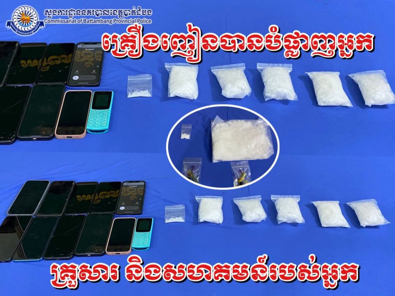 ខេត្តបាត់ដំបង៖ កាលថ្ងៃទី១៧ខែមីនា ឆ្នាំ២០២៦ នៅចំណុចភូមិចំការសំរោង១ សង្កាត់ចំការសំរោងក្រុងបាត់ដំបង ខេត្តបាត់ដំបង សស្របតាមអនុសាសន៍នាយឧត្តមសេនីយ៍ ស ថេត អគ្គស្នងការនគរ បាលជាតិ និងការ ចង្អុលទិសដឹកនាំរបស់លោកឧត្តមសេនីយ៍ទោ ដាញ់ អេងប៊ុនចាន់ ស្នងការនៃស្នងការដ្ឋាននគរបាលខេត្តបាត់ដំបង និងដោយបានការសម្របសម្រួលលេីនីតិវិធីពីឯកឧត្តម មាស ច័ន្ទពិសិដ្ឋ ព្រះរាជអាជ្ញានៃអយ្យការអម សាលាដំ បូងខេត្តបាត់ដំបងផងនោះលោកវរសេនីយ៍ឯក សុខ និមល ស្នងការរងផែនការងារប្រឆាំងគ្រឿងញៀនដោយ មានលោកវរសេនីយ៍ទោប៉ាន ចាន់រិទ្ធ ជានាយការិយាល័យដឹកនាំកម្លាំងបង្រ្កាបករណីរក្សាទុកដោយខុសច្បាប់នូវសារធាតុញៀន០១ករណីក្នុងបទល្មើសជាក់ស្តែងនិងឃាត់ខ្លួនជនសង្ស័យបានចំនួន០៨នាក់ប្រុស។