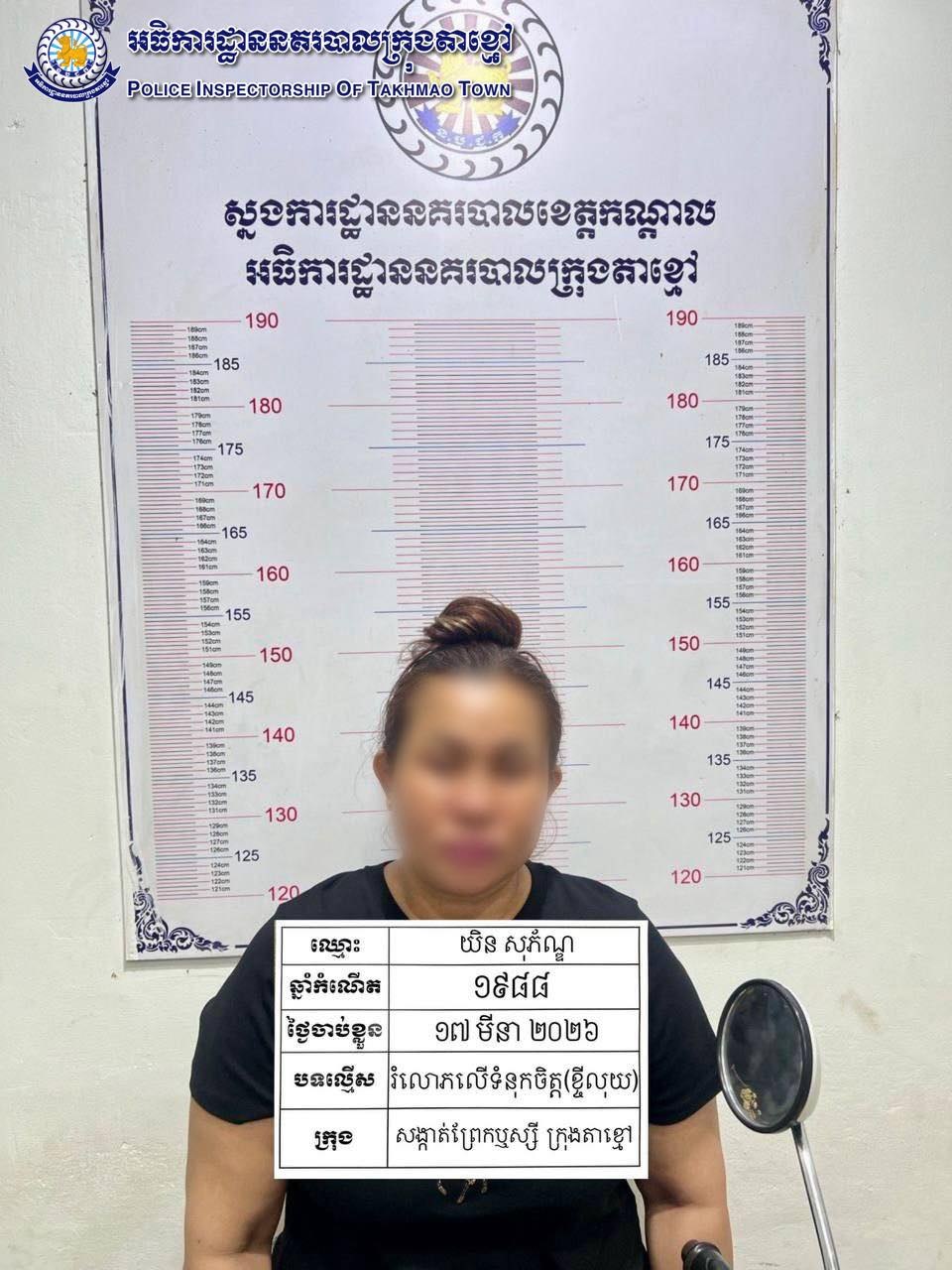ដោយអនុវត្តតាមបទបញ្ជារបស់ លោកឧត្តមសេនីយ៍ទោ ឈឿន សុចិត្ត ស្នងការ នៃស្នងការដ្ឋាននគរបាលខេត្តកណ្តាល នៅថ្ងៃទី១៤ខែមីនាឆ្នាំ២០២៦ ក្រោយទទួលពាក្យបណ្តឹងពីជនរងគ្រោះ កម្លាំងជំនាញនៃអធិការដ្ឋាននគរបាលក្រុងតាខ្មៅបានធ្វើការឃាត់ខ្លួនជនសង្ស័យ១នាក់ ចំណុចភូមិព្រែកឬស្សីលិច សង្កាត់ព្រែកឬស្សី ក្រុងតាខ្មៅ ខេត្តកណ្តាល ពាក់ព័ន្ធករណីរំលោភលើទំនុកចិត្ត(ខ្ចីលុយ) ជនសង្ស័យមានឈ្មោះ យិន សុភ័ណ្ឌ ភេទស្រី អាយុ ៣៨ឆ្នាំ ជនជាតិខ្មែរ មានទីលំនៅភូមិព្រែកតាព្រីង សង្កាត់សិត្បូ ក្រុងតាខ្មៅ ខេត្តកណ្តាល មុខរបរលក់ដូរ ។