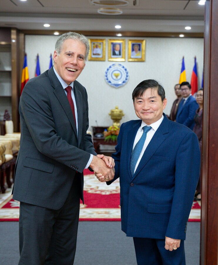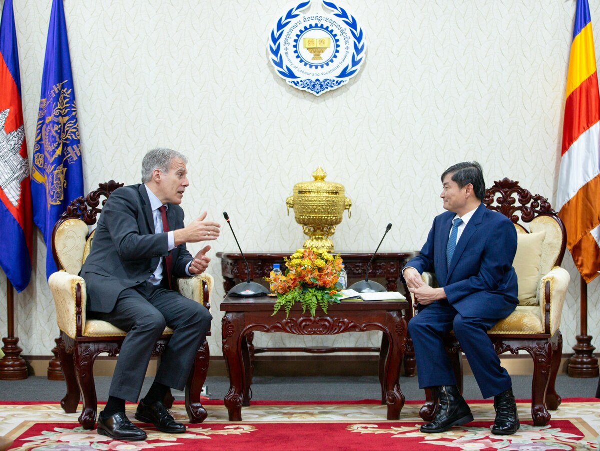 (រាជធានីភ្នំពេញ)៖ នារសៀលថ្ងៃពុធ ទី១៨ ខែមីនា ឆ្នាំ២០២៦ ឯកឧត្តម ហេង សួរ រដ្ឋមន្ត្រីក្រសួងការងារ និងបណ្តុះបណ្តាលវិជ្ជាជីវៈ បានអនុញ្ញាតឱ្យឯកឧត្តម គ្រីស្ទៀន ដេរ៉ូហ្ស (Christian DesRoches) ឯកអគ្គរដ្ឋទូតវិសាមញ្ញ និងពេញសមត្ថភាពនៃប្រទេសកាណាដាប្រចាំកម្ពុជា ចូលជួបសម្ដែងការគួរសម និងពិភាក្សាការងារ នៅទីស្តីការក្រសួង ដើម្បីពង្រឹងកិច្ចសហប្រតិបត្តិការទ្វេភាគីលើវិស័យការងារ សន្តិសុខសង្គម និងការបណ្តុះបណ្តាលវិជ្ជាជីវៈ។