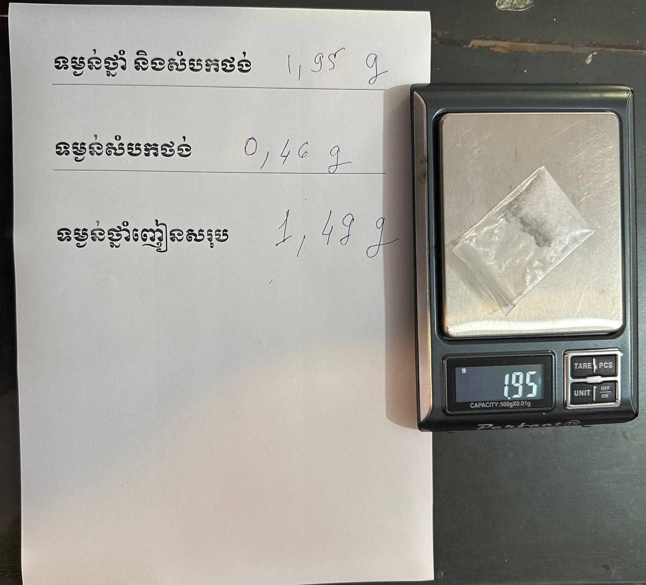 ប្រភពពីសមត្ថកិច្ចបានឲ្យដឹងថា ជនសង្ស័យដែលត្រូវឃាត់ខ្លួនទាំង ៣នាក់ ទី១មានឈ្មោះ ថុន ផានិត ហៅចិន ភេទ ប្រុស អាយុ ២៨ឆ្នាំទី២ឈ្មោះ ម៉ង់ ម៉ៅ ភេទស្រី អាយុ៣៤ឆ្នាំនិងទី៣ឈ្មោះ ព្រឿង ចន្ថា ហៅថា ភេទប្រុស អាយុ២៨ឆ្នាំ ទាំង ៣នាក់ នេះមានសារធាតុញៀនក្នុងទឹកនោមវិជ្ជមានដូចគ្នា។ ចំណែកឯបក្ខពួក ២នាក់ទៀតដែលបានរត់គេចខ្លួនឈ្មោះឈួន ពយ ភេទ ប្រុស អាយុ៣៥ឆ្នាំ) និងឈ្មោះ ហុង សានទិ ភេទប្រុស, អាយុ ២៩ឆ្នាំ។ ក្នុងប្រតិបត្តិការនេះ សមត្ថកិច្ចបានដក ហូតវត្ថុតាងរួមមាន ម្សៅក្រាមពណ៌សថ្លាសង្ស័យជាគ្រឿងញៀន ៦កញ្ចប់តូច (ទម្ងន់ ១,៤៩ក្រាម), ទូរស័ព្ទដៃ ២គ្រឿង, អាយផេត ១គ្រឿង និងសម្ភារៈប្រើប្រាស់វេចខ្ចប់មួយចំនួន។