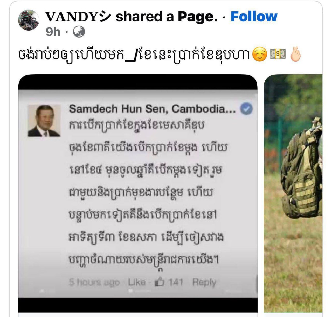 សម្តេចតេជោ ហ៊ុន សែន បានរៀបរាប់សារយ៉ាងដូច្នេះថា «តើពួកក្បត់ជាតិនេះបើមិនបានភូតកុហកវាងាប់ឬអី? បានជាពួកវាបន្តបោកប្រាស់ប្រជាជនបែបនេះ។ កន្លងមកពួកក្បត់ជាតិបង្កើតផេកហ្វេកបុកក្លែងក្លាយមួយ ដែលមានរូបថត និងឈ្មោះខ្ញុំនិងតែងបង្ហោះព័ត៌មានមិនពិត។ ខ្ញុំសូមបងប្អូនអ្នកប្រើប្រាស់ ហ្វេសបុកប្រុងប្រយ័ត្ន កុំចាញ់បោកពួកក្បត់ជាតិទាំងនេះ។ ខ្ញុំមានហ្វេសបុកតែមួយដែលមានអ្នកតាមដានជាង១៥លាននាក់ដែលខ្ញុំសូមបង្ហោះភ្ជាប់ជាមួយ»៕