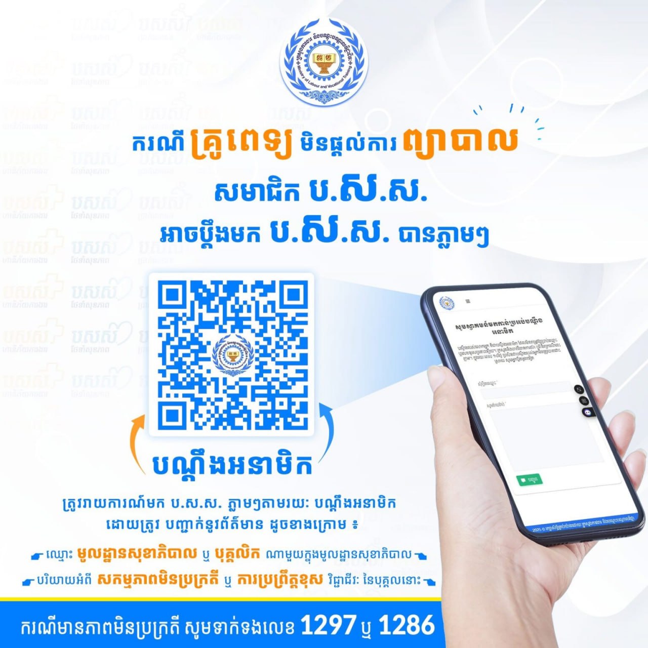 • ក្នុងនោះ ដើម្បីរាយការណ៍ទៅកាន់ ប.ស.ស តាមរយៈប្រអប់បណ្ដឹងអនាមិក លោកអ្នកគ្រាន់តែចុចស្កេន QR កូដ រួចត្រង់ប្រអប់ «សុំប្ដឹងឈ្មោះ» លោកអ្នកត្រូវវាយបញ្ចូលឈ្មោះមូលដ្ឋានសុខាភិបាល ឬឈ្មោះបុគ្គលិកណាមួយ ក្នុងមូលដ្ឋានសុខាភិបាលដែលដែលលោកអ្នកចង់ប្ដឹង។