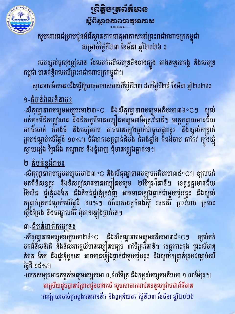 ក្រសួងធនធានទឹក ជូនដំណឹងអំពីស្ថានភាពធាតុអាកាសនៅកម្ពុជា សម្រាប់ថ្ងៃទី២៣ ខែមីនា ឆ្នាំ២០២៦