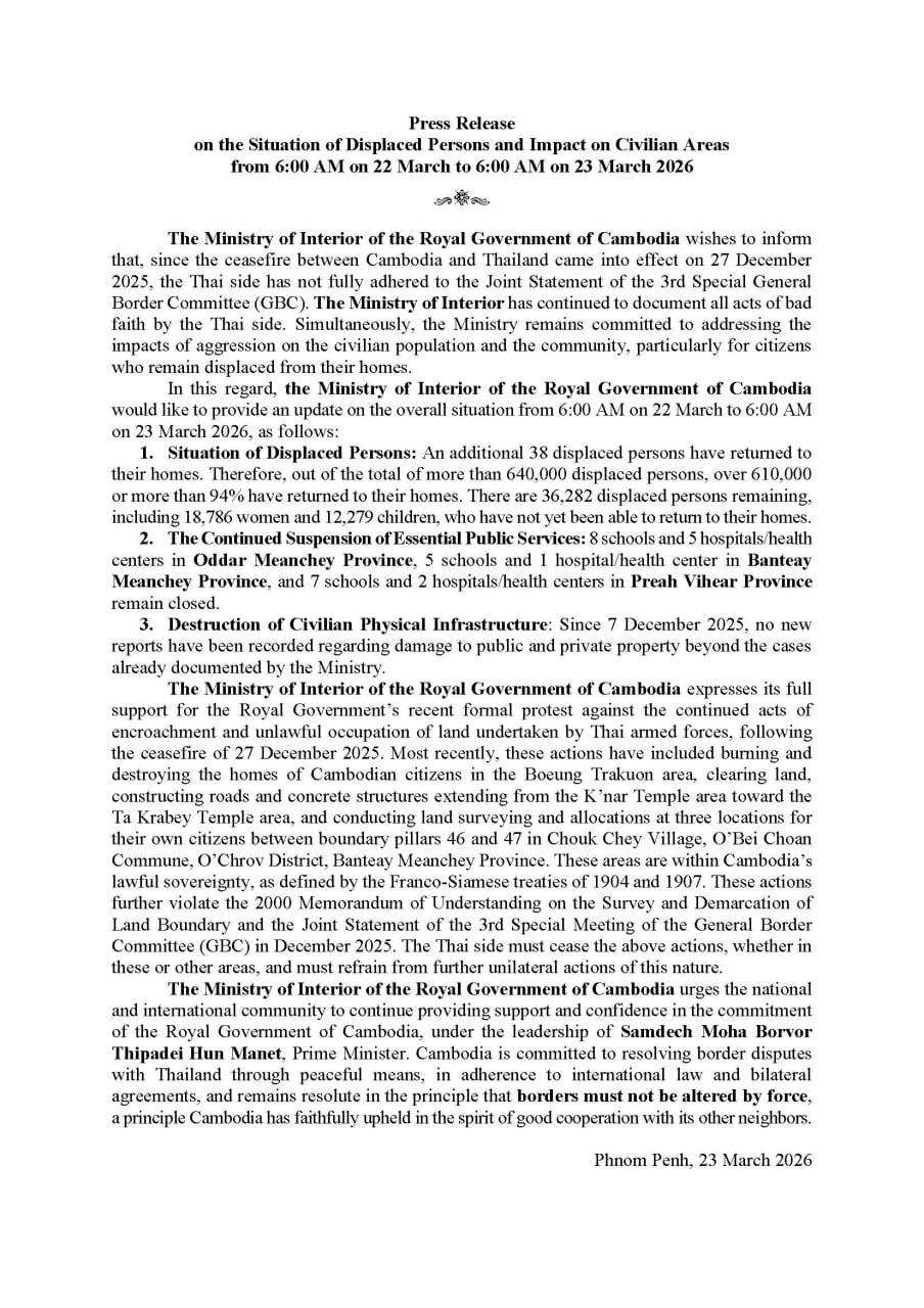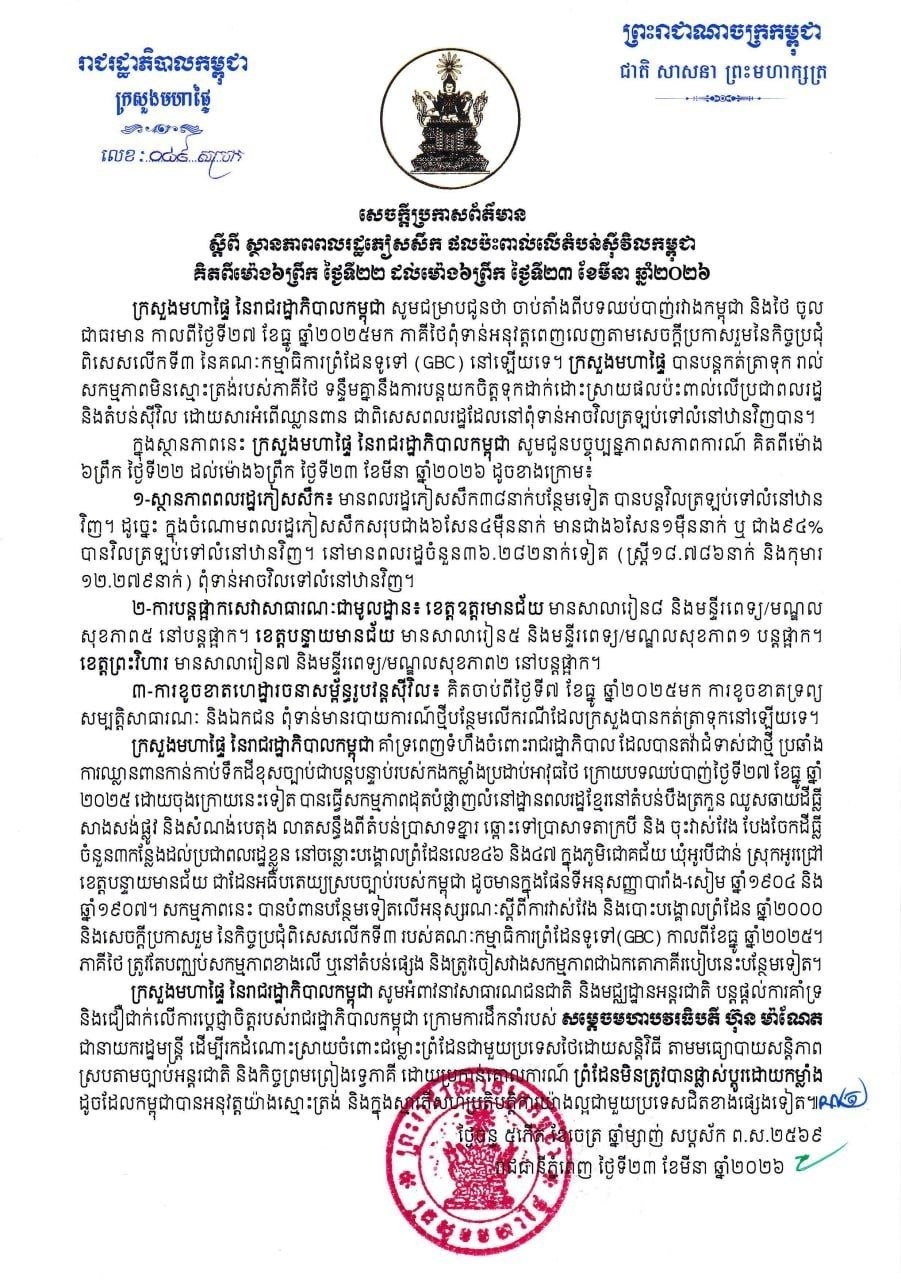 (ភ្នំពេញ)៖ ក្រសួងមហាផ្ទៃ នៅថ្ងៃទី២៣ ខែមីនា ឆ្នាំ២០២៦នេះ បានឲ្យដឹងថា គិតចាប់ពីម៉ោង ៦ព្រឹក ថ្ងៃទី២២ ដល់ម៉ោង៦ព្រឹក ថ្ងៃទី២៣ ខែមីនា ឆ្នាំ២០២៦នេះ មានប្រជាពលរដ្ឋភៀសសឹក ៣៨នាក់បន្ថែមទៀត បានវិលត្រឡប់ទៅលំនៅឋានវិញ។ ដូច្នេះក្នុងចំណោមពលរដ្ឋភៀសសឹកសរុបជាង៦សែន ៤ម៉ឺននាក់ មានជាង ៦សែន ១ម៉ឺននាក់ ស្មើជាង ៩៤ភាគរយ បានវិលត្រឡប់ទៅលំនៅឋានវិញ។