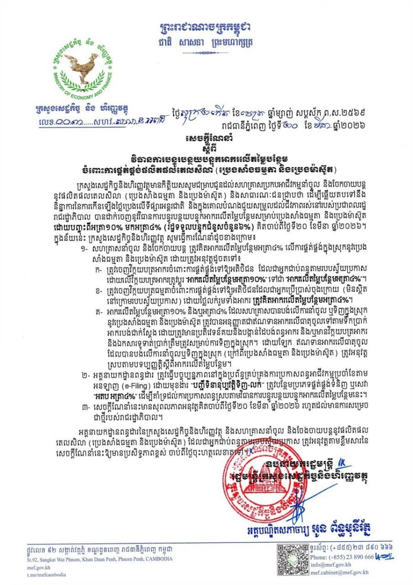 ក្រសួងសេដ្ឋកិច្ច និងហិរញ្ញវត្ថុ ក៏បានណែនាំដល់ អគ្គនាយកដ្ឋានពន្ធដារ ត្រូវធ្វើបច្ចុប្បន្នភាពនៅក្នុងប្រព័ន្ធគ្រប់គ្រងការប្រកាសពន្ធអាជីវកម្មប្រចាំខែតាម អនឡាញ (e-Filing) ដោយមុខងារ “បញ្ជីទិនានុប្បវត្តិទិញ-លក់ ត្រូវបន្ថែមប្រភេទផ្គត់ផ្គង់ទំនិញ ឬសេវា “អតប អត្រា៤% ដើម្បីគាំទ្រដល់ការប្រកាសពន្ធស្របតាមវិធានការបន្ធូរបន្ថយបន្ទុកអាករលើតម្លៃបន្ថែមនេះផងដែរ៕