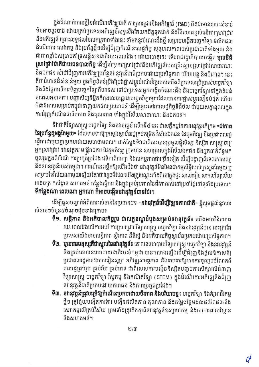 ទិវាជាតិ វិទ្យាសាស្ត្រ បច្ចេកវិទ្យា និងនវានុវត្តន៍ រៀបចំឡើងក្នុងគោលបំណងផ្សព្វផ្សាយ ពង្រីកការយល់ដឹងអំពីសមិទ្ធផល ការវិវត្តជឿនលឿន និងចក្ខុវិស័យ ផ្នែកវិទ្យាសាស្ត្រ បច្ចេកវិទ្យា និងនវានុវត្តន៍របស់កម្ពុជា សំដៅគាំទ្រការអភិវឌ្ឍសង្គម-សេដ្ឋកិច្ច ស្របតាមចក្ខុវិស័យរបស់ រាជរដ្ឋាភិបាល៕