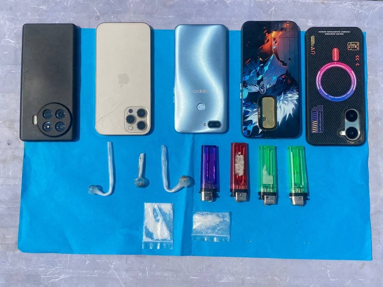 ដោយចាប់យកវត្ថុតាងបានរួមមាន៖ម្សៅក្រាមសថ្លាសង្ស័យជាសាធាតុញៀន ចំនួន០២កញ្ចប់ (ទម្ងន់១.៤៣ក្រាម),រថយន្តចំនួន០១គ្រឿង,ទូរស័ព្ទចំនួន០៥គ្រឿង,ម៉ូតូចំនួន០២គ្រឿង,ដែកកេះចំនួន០៤ និងខ្សៀជក់គ្រឿងញៀនមួយចំនួនទៀត។