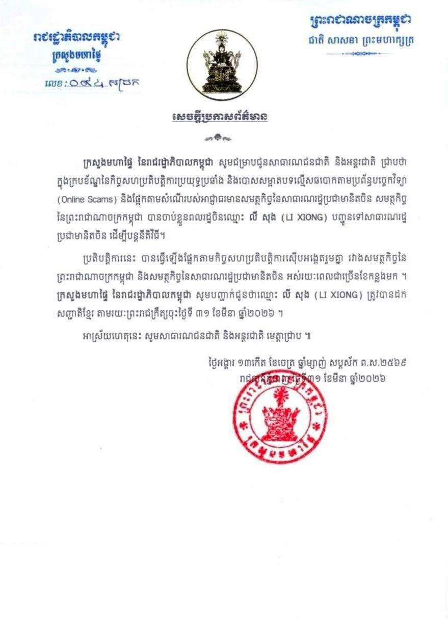 ក្រសួងមហាផ្ទៃ នៃរាជរដ្ឋាភិបាលកម្ពុជា សូមបញ្ជាក់ជូនថា ឈ្មោះ លី សុង (LI XIONG) ត្រូវបានដកសញ្ជាតិខ្មែរ តាមរយៈព្រះរាជក្រឹត្យចុះថ្ងៃទី ៣១ ខែមីនា ឆ្នាំ២០២៦៕
