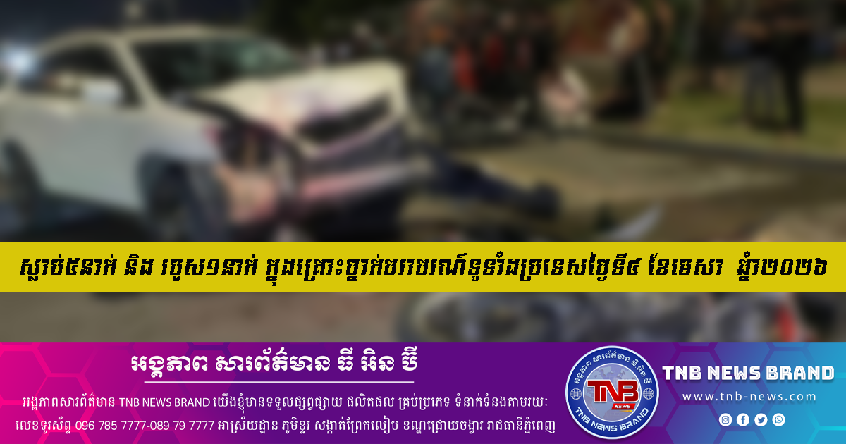 ស្លាប់៥នាក់ និងរបួស១នាក់ ក្នុងគ្រោះថ្នាក់ចរាចរណ៍ទូទាំងប្រទេសថ្ងៃទី៤ ខែមេសា ឆ្នំា២០២៦