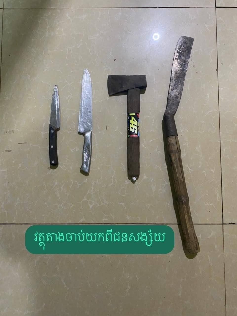 វត្ថុតាងចាប់យក ÷កាំបិតផ្គាក់ផ្លែដែកដងឬស្សីចំនួន ០១ ពូថៅធ្វើពីដែកដងឈើចំនួន០១- កាំបិតចុងស្រួច តូចធំ ចំនួន០២ ។