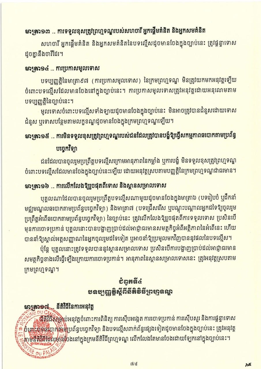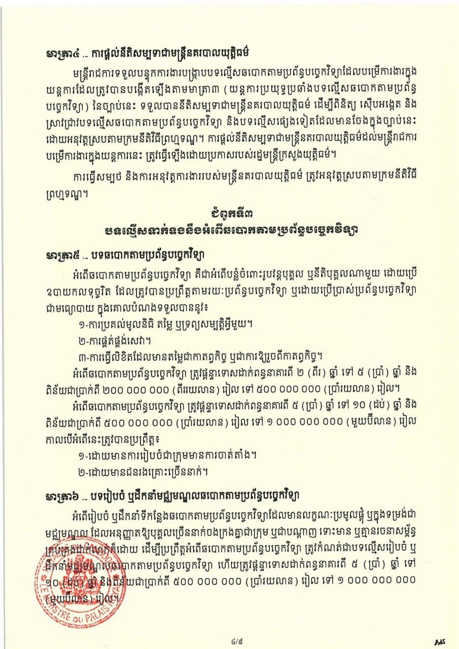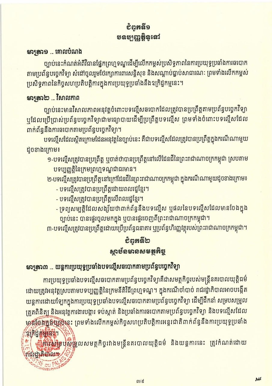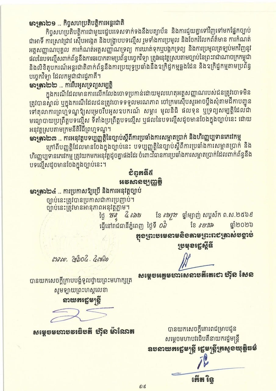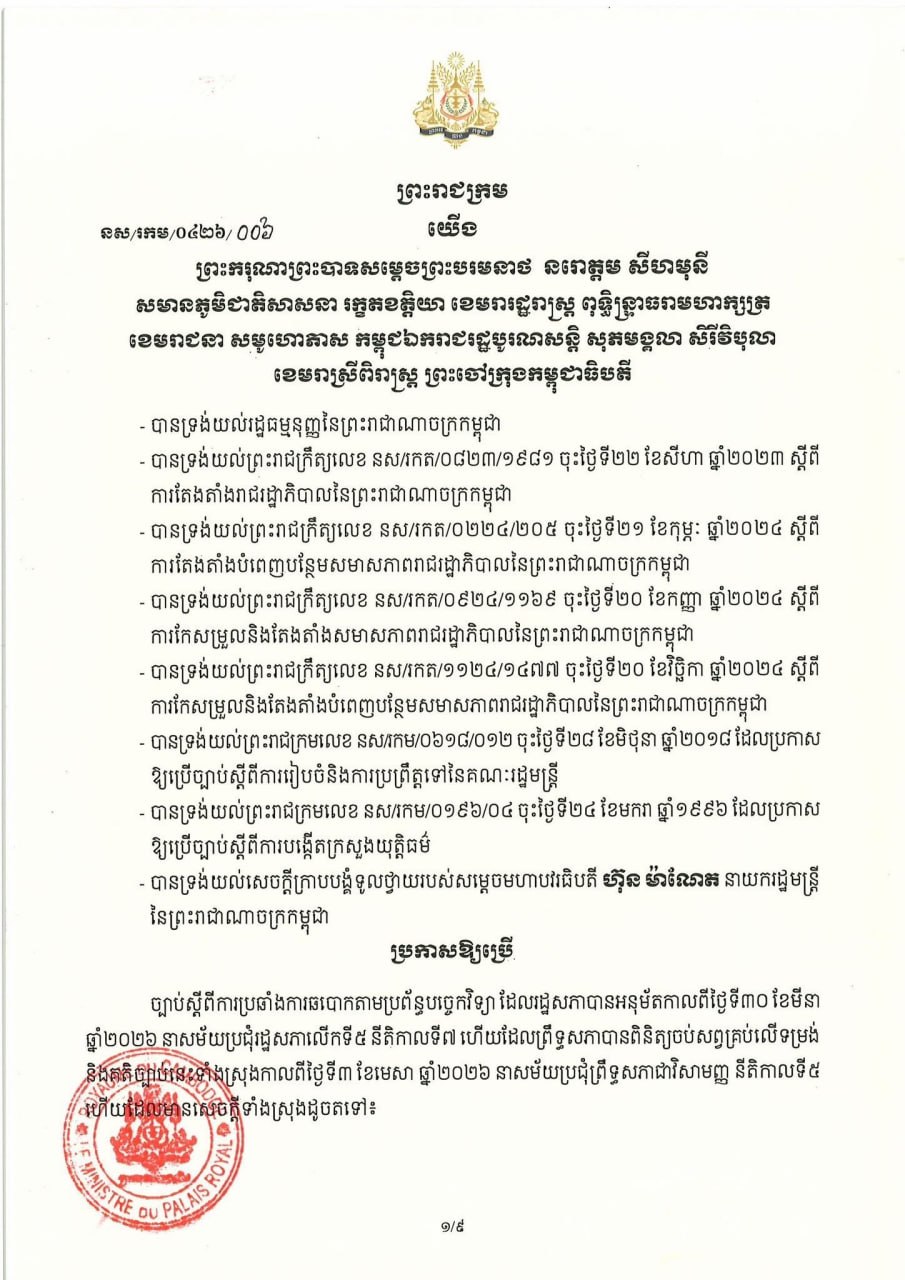 (ភ្នំពេញ)៖ សម្តេចតេជោ ហ៊ុន សែន ប្រមុខរដ្ឋស្តីទី នៅថ្ងៃទី០៦ ខែមេសា ឆ្នាំ២០២៦ បានចេញព្រះរាជក្រម ប្រកាសឱ្យប្រើច្បាប់ស្តីពីការប្រឆាំងការឆបោកតាមប្រព័ន្ធបច្ចេកវិទ្យា ដែលរដ្ឋសភាបានអនុម័តកាលពីថ្ងៃទី៣០ ខែមីនា ឆ្នាំ២០២៦ នាសម័យប្រជុំរដ្ឋសភាលើកទី៥ នីតិកាលទី៧ ហើយដែលព្រឹទ្ធសភាបានពិនិត្យចប់សព្វគ្រប់លើទម្រង់ និងគតិ ច្បាប់នេះទាំងស្រុងកាលពីថ្ងៃទី៣ ខែមេសា ឆ្នាំ២០២៦ នាសម័យប្រជុំព្រឹទ្ធសភាជាវិសាមញ្ញ នីតិកាលទី៥។