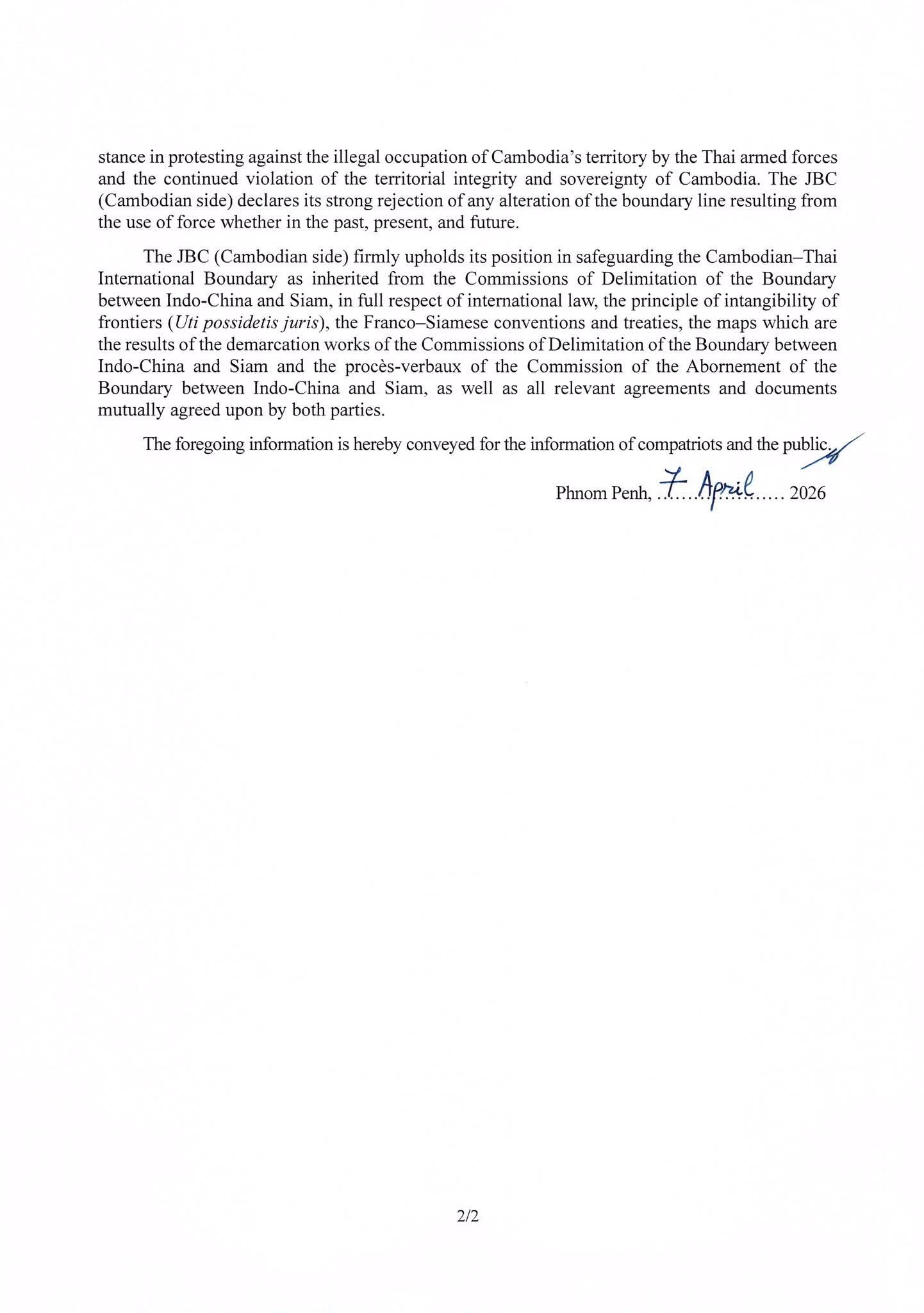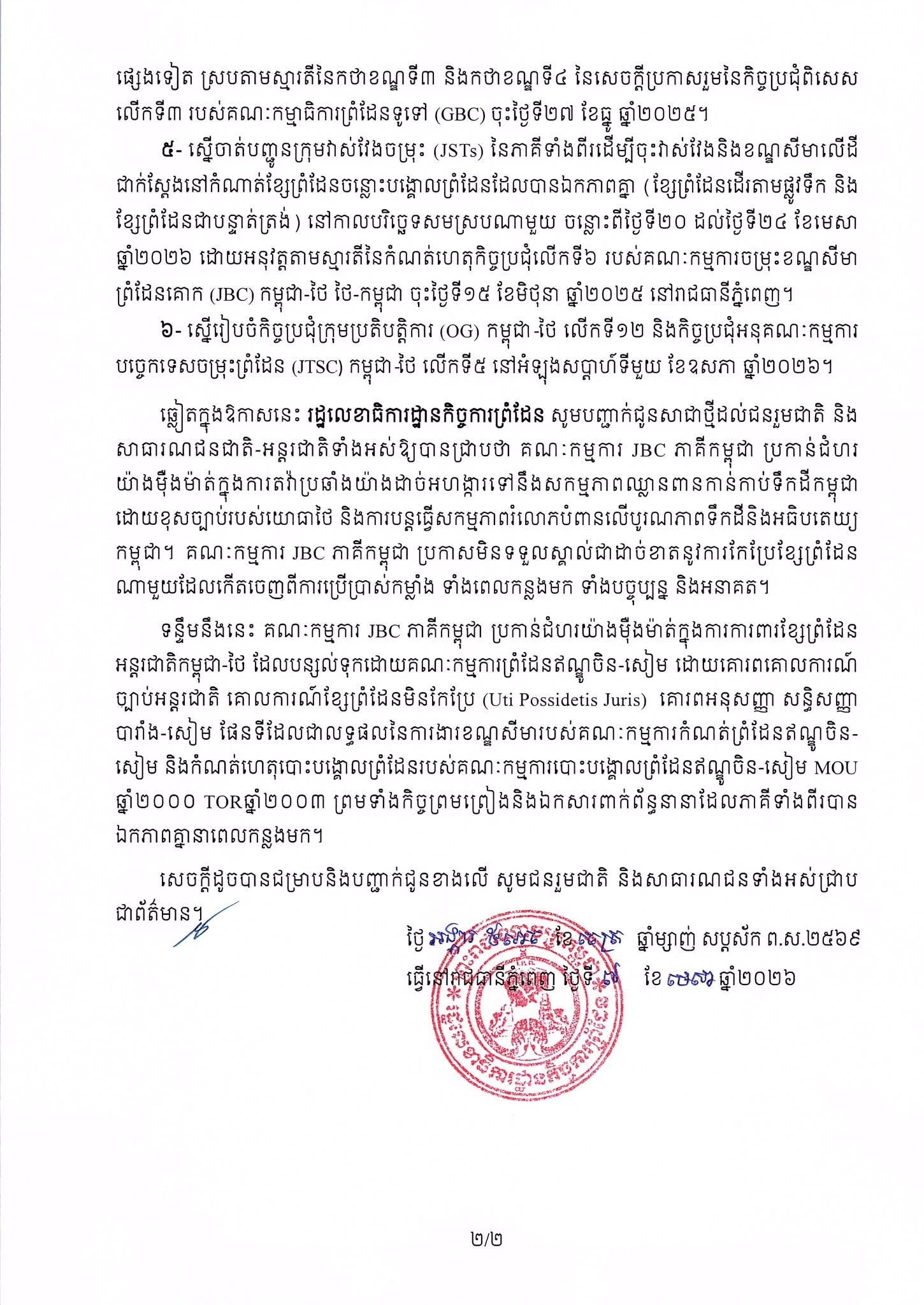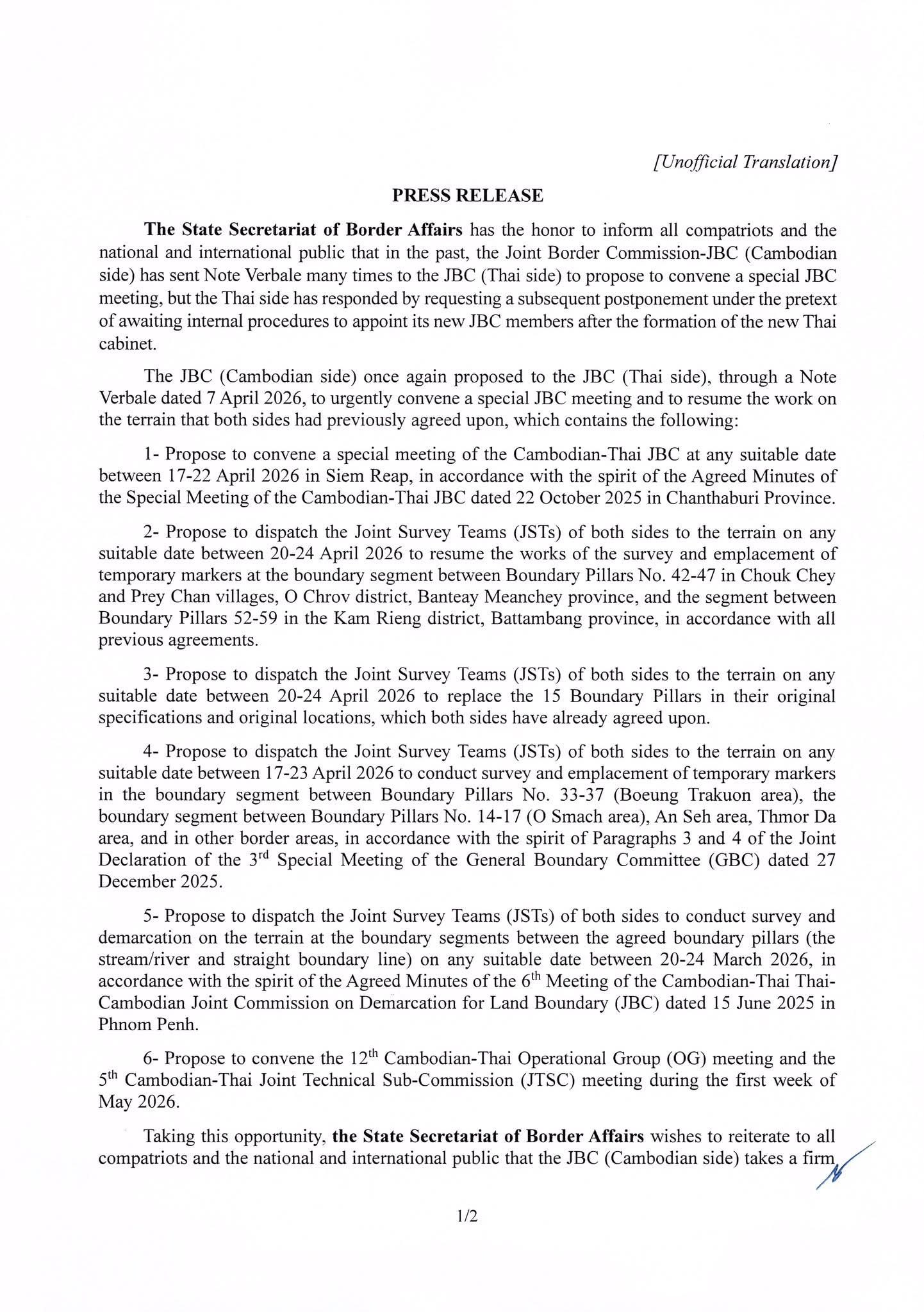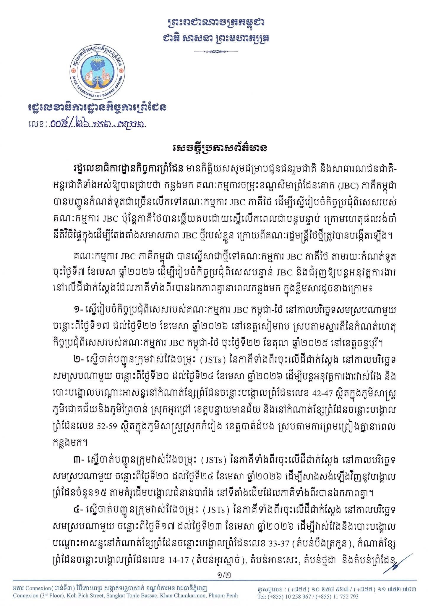 គណៈកម្មការចម្រុះខណ្ឌសីមាព្រំដែនគោក (JBC) ភាគីកម្ពុជា ស្នើឱ្យមានកិច្ចប្រជុំពិសេសបន្ទាន់ JBC កម្ពុជា-ថៃ ចន្លោះថ្ងៃទី១៧-២២ ខែមេសា។