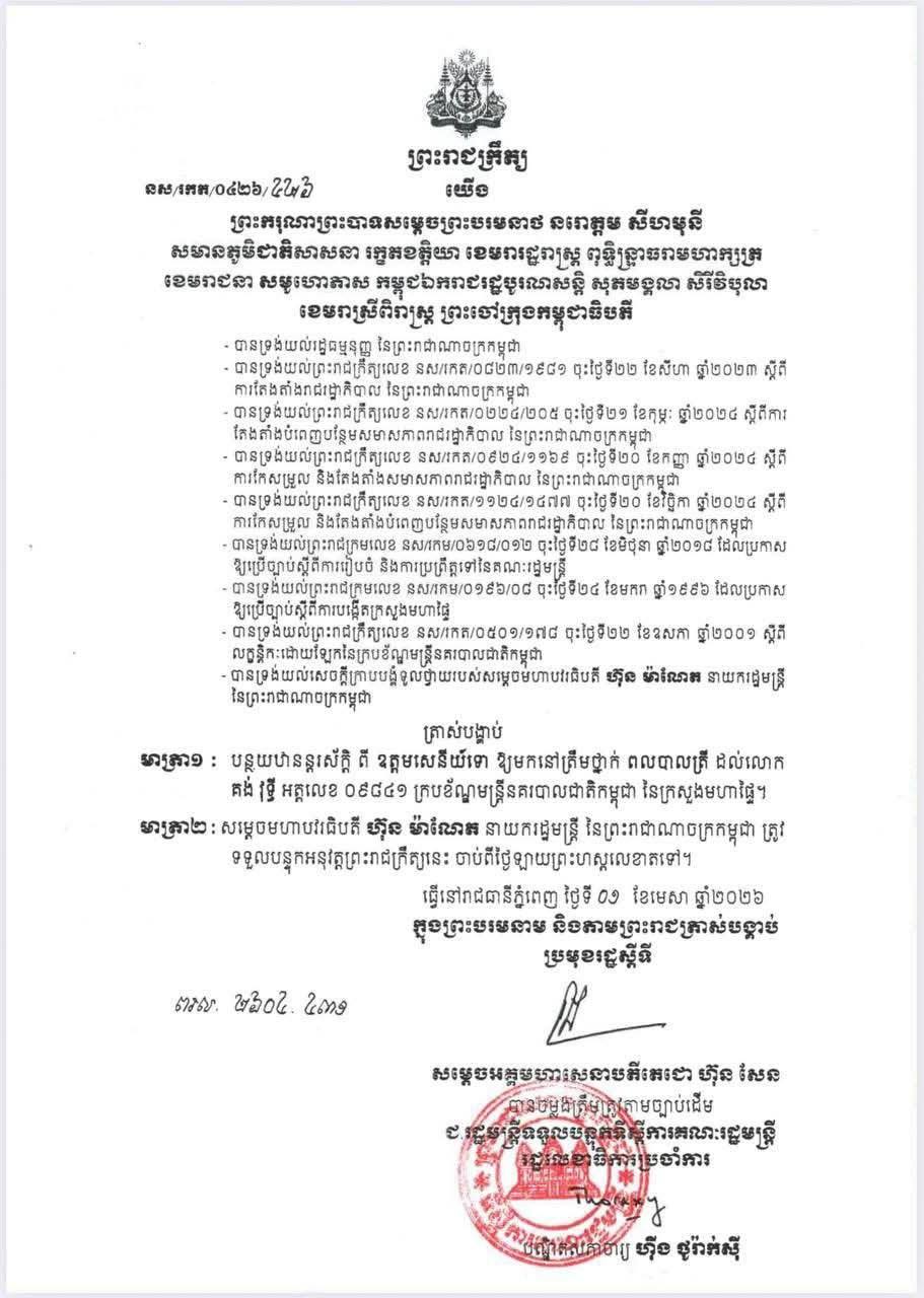 សូមជម្រាបថា សម្តេចតេជោ ហ៊ុន សែន ប្រមុខរដ្ឋស្តីទី តាមរយៈព្រះរាជក្រឹត្យចុះថ្ងៃទី១ ខែមេសា ឆ្នាំ២០២៦ បានបន្ថយឋានន្តរស័ក្តិ លោក គង់ វុទ្ធី អត្តលេខ ០៩៨៤១ ពីឧត្តមសេនីយ៍ទោ ឱ្យមកនៅត្រឹមថ្នាក់ ពលបាលត្រី ក្នុងក្របខ័ណ្ឌមន្ត្រីនគរបាលជាតិកម្ពុជា នៃក្រសួងមហាផ្ទៃ។