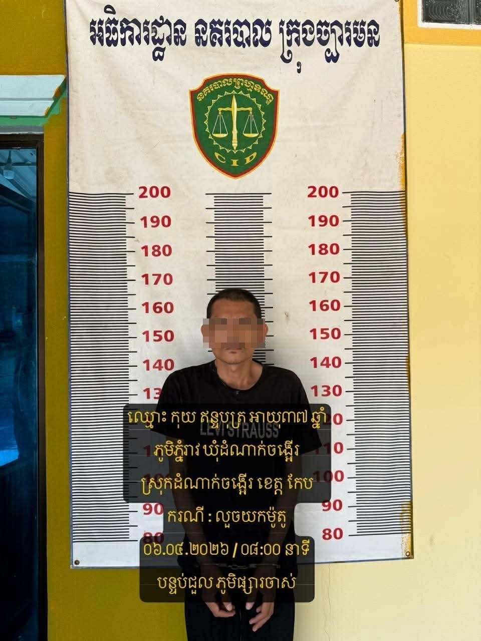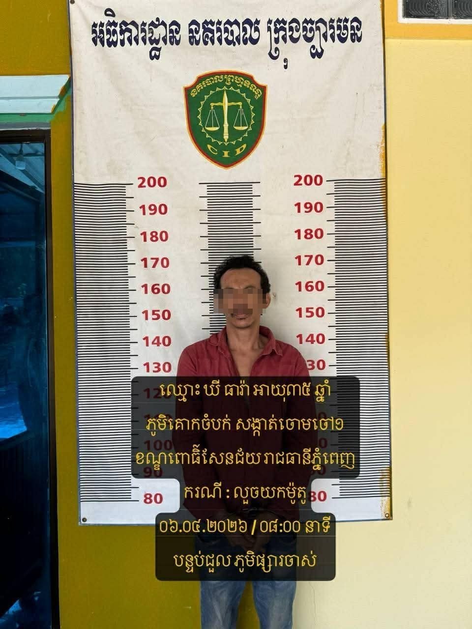 ប្រភពពីសមត្ថកិច្ចបានឲ្យដឹងថា នៅថ្ងៃទី០៦ ខែមេសា ឆ្នាំ២០២៦ វេលាម៉ោង០៨:០០ នាទី កម្លាំងជំនាញនគរបាលយុត្តិធម៌ក្រុងច្បារមន សហការជាមួយកម្លាំងប៉ុស្ដិ៍ស្វាយក្រវ៉ាន់ បានចុះស្រាវជ្រាវ ក្នុងករណី លួចម៉ូតូ នៅចំណុចមុខបន្ទប់ជួលស្ថិត ភូមិផ្សារចាស់ សង្កាត់ស្វាយក្រវ៉ាន់ ក្រុងច្បារមន ខេត្តកំពង់ស្ពឺ បានឈានដល់ការកំណត់មុខសញ្ញា នឹងធ្វើការបង្រ្កាបបាន ជនសង្ស័យ នឹងវត្ថុតាង នៅរាជធានីភ្នំពេញ ជនសង្ស័យ២នាក់÷