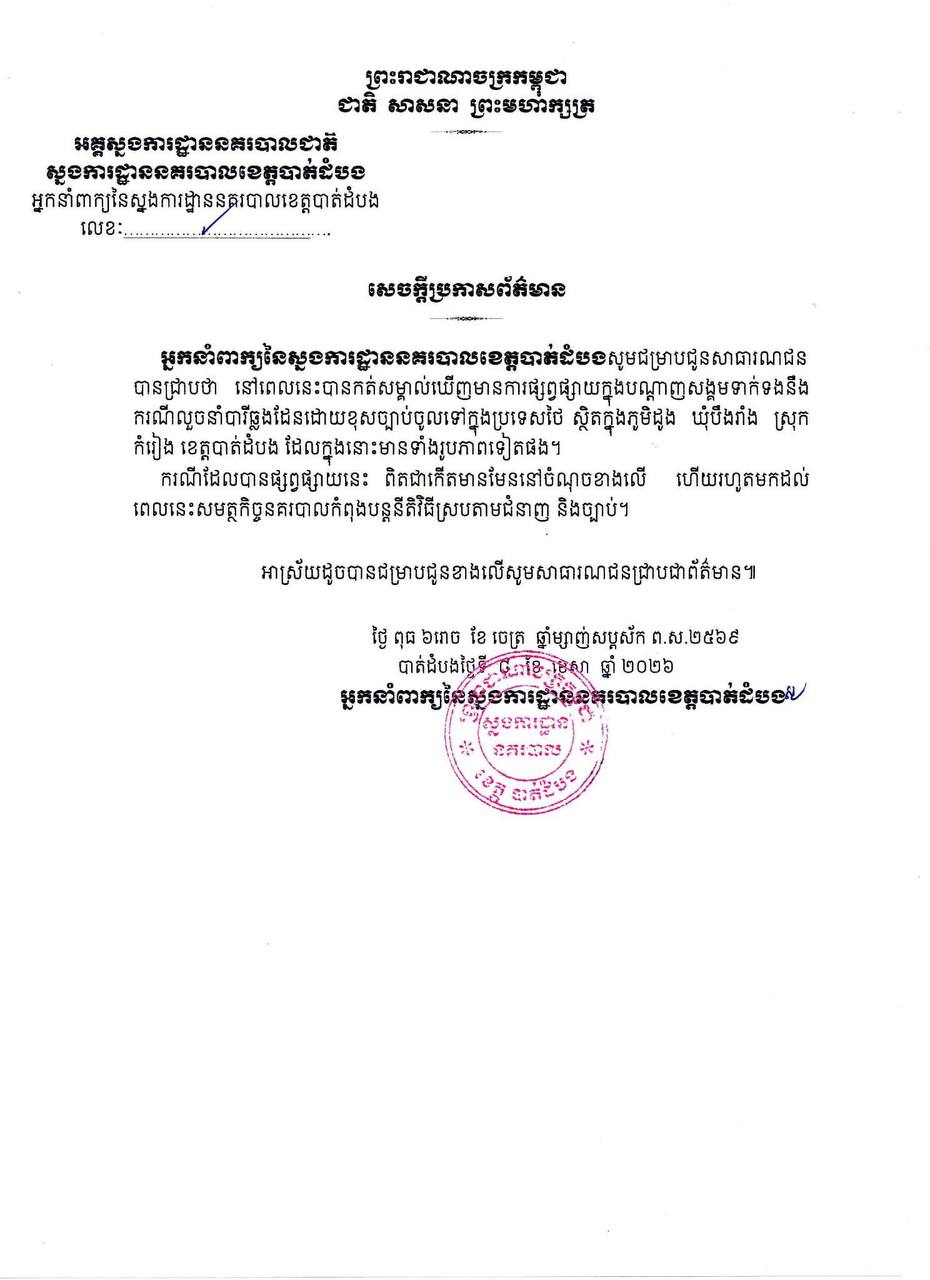 ស្នងការនគរបាលខេត្តបាត់ដំបង បានទទួលស្គាល់ថា ពិតជាមានបទល្មើសលួចនាំបារីទៅកាន់ប្រទេសថៃ ដោយខុសច្បាប់ ហើយនៅពេលនេះកម្លាំងជំនាញកំពុងស្រាវជ្រាវ ដើម្បីចុះបង្ក្រាប។