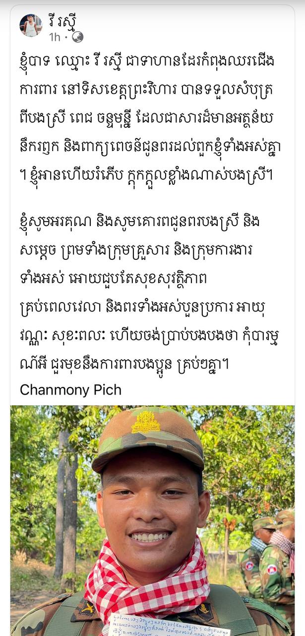 ខេត្តព្រះវិហារ ៖ វីរៈកងទ័ព វី រស្មី បានបង្ហោះលើបណ្តាញសង្គមថា ខ្ញុំបាទ ឈ្មោះ វី រស្មី ជាទាហានដែរ កំពុង ឈរជើងការពារ នៅទិសខេត្តព្រះវិហារ បានទទួលសំបុត្រ ពីបងស្រី ពេជ ចន្ទមុន្នី ដែល ជាសារ ដ៏មានអត្ថន័យ នឹករឭក និង ពាក្យពេចន៍ ជូនពរដល់ពួកខ្ញុំទាំងអស់គ្នា ។ ខ្ញុំអានហើយរំភើប ក្តុកក្តួល ខ្លាំងណាស់បងស្រី។