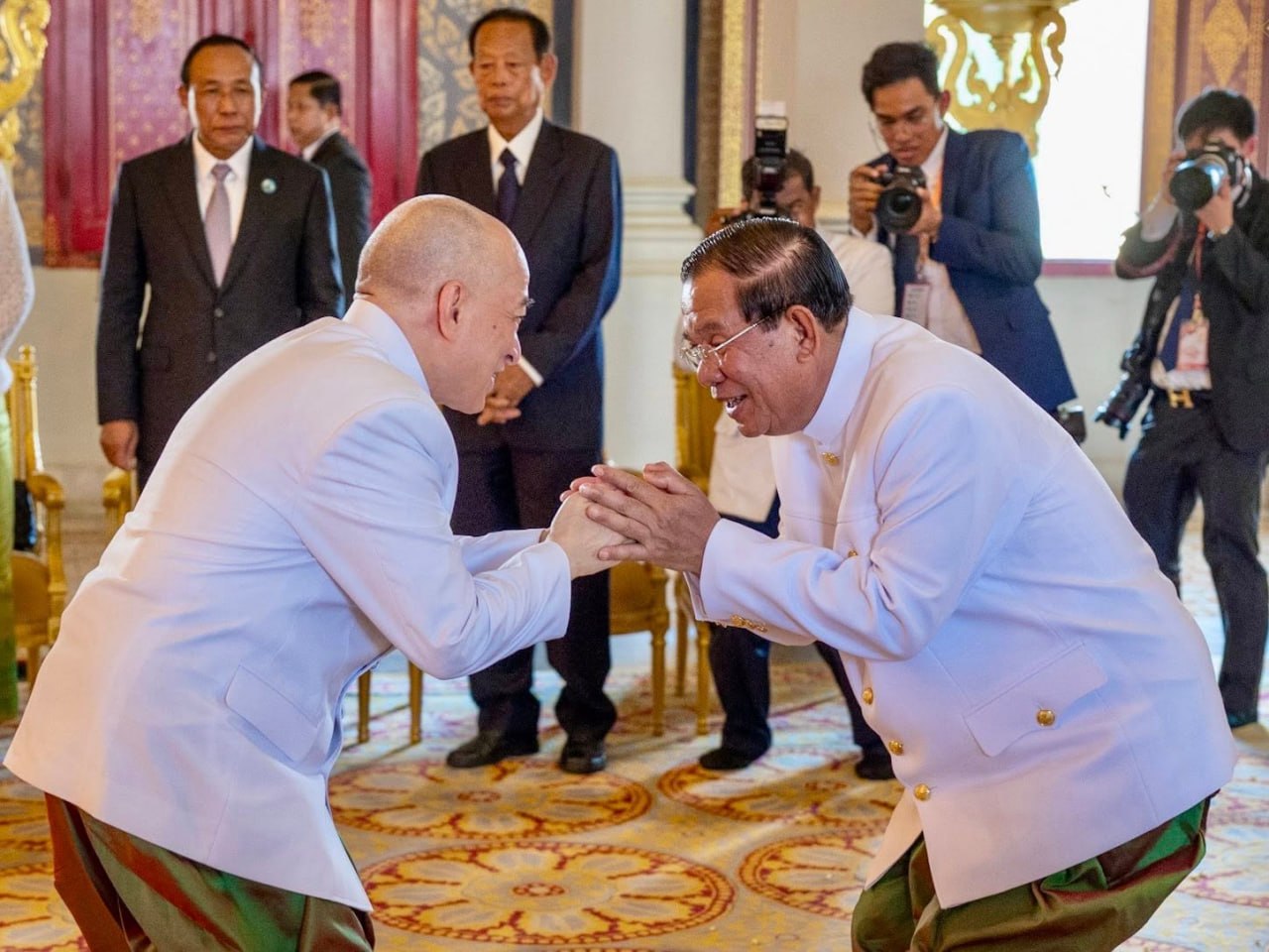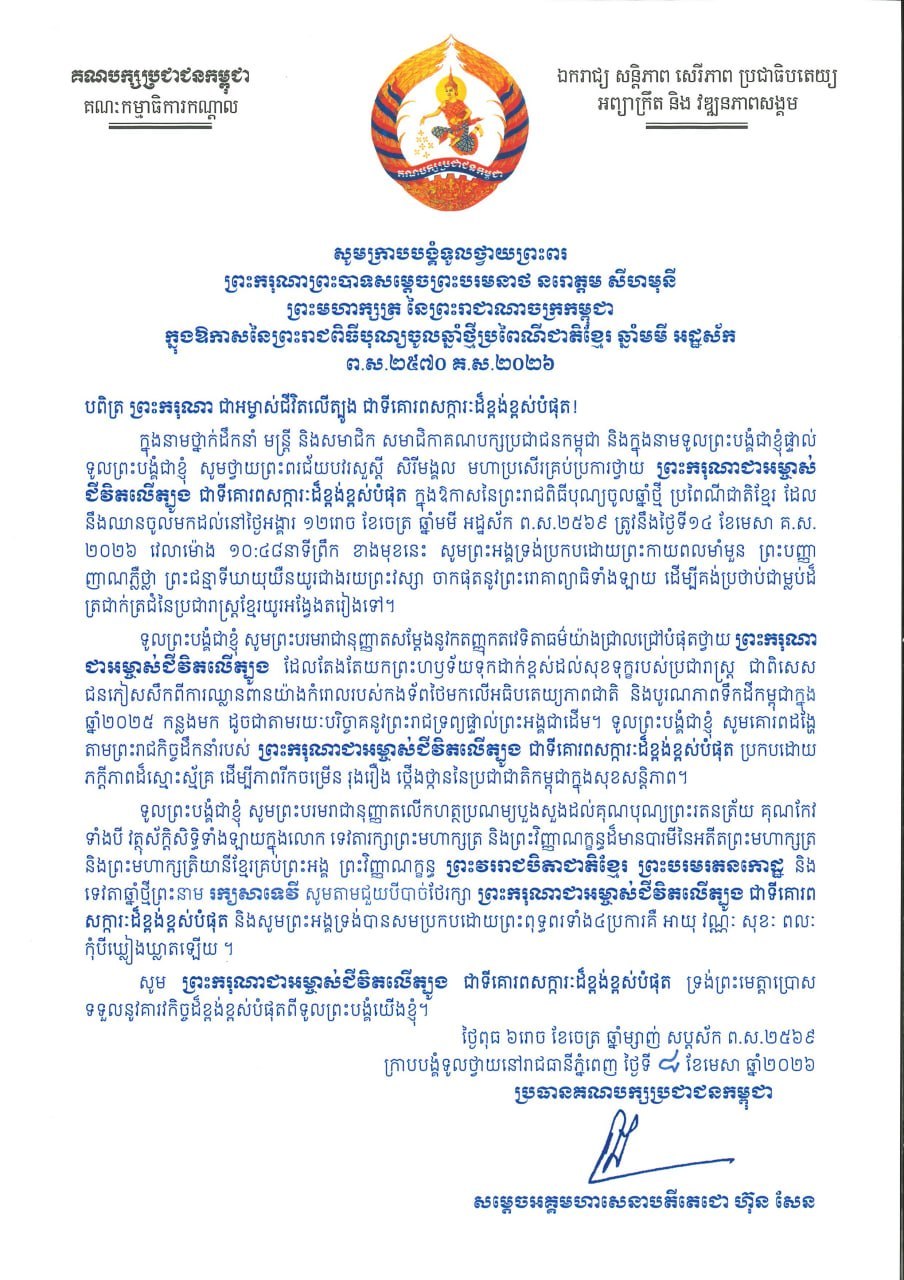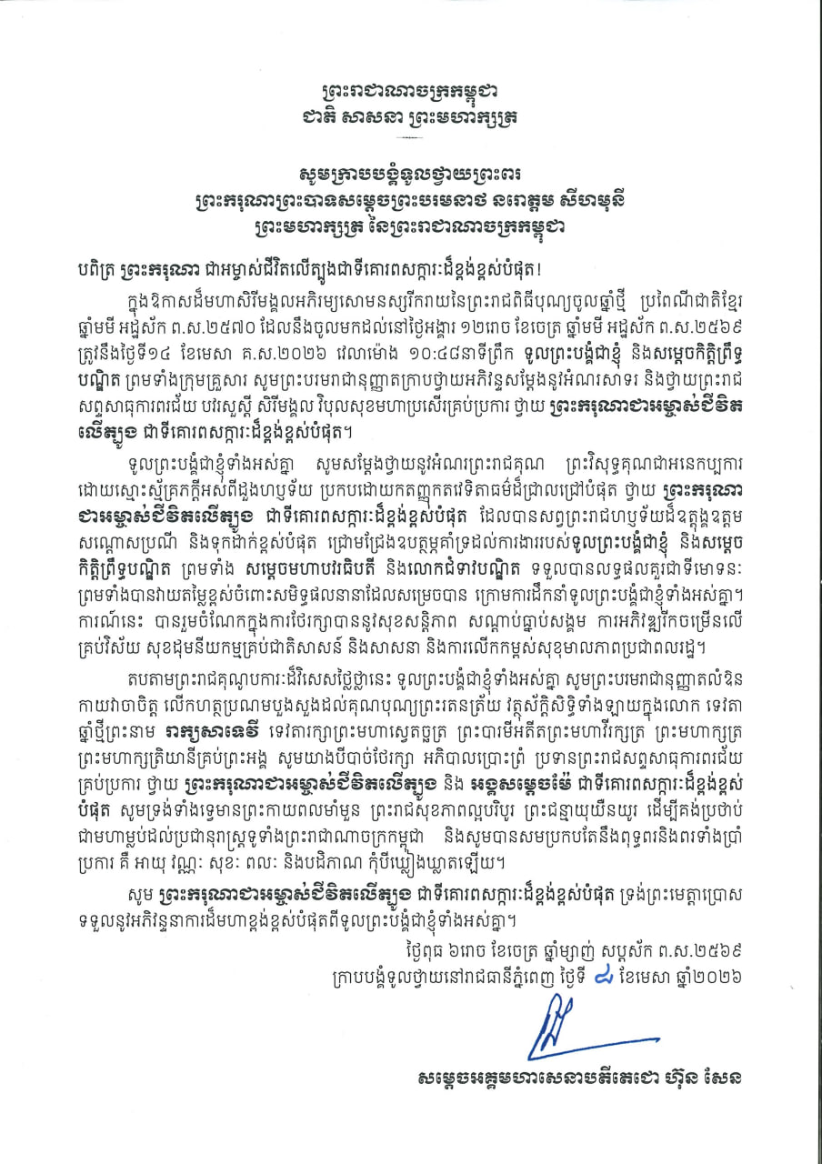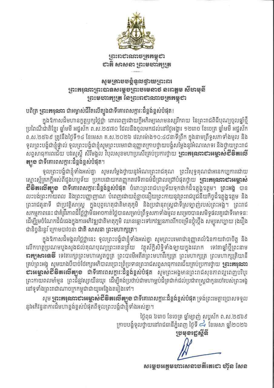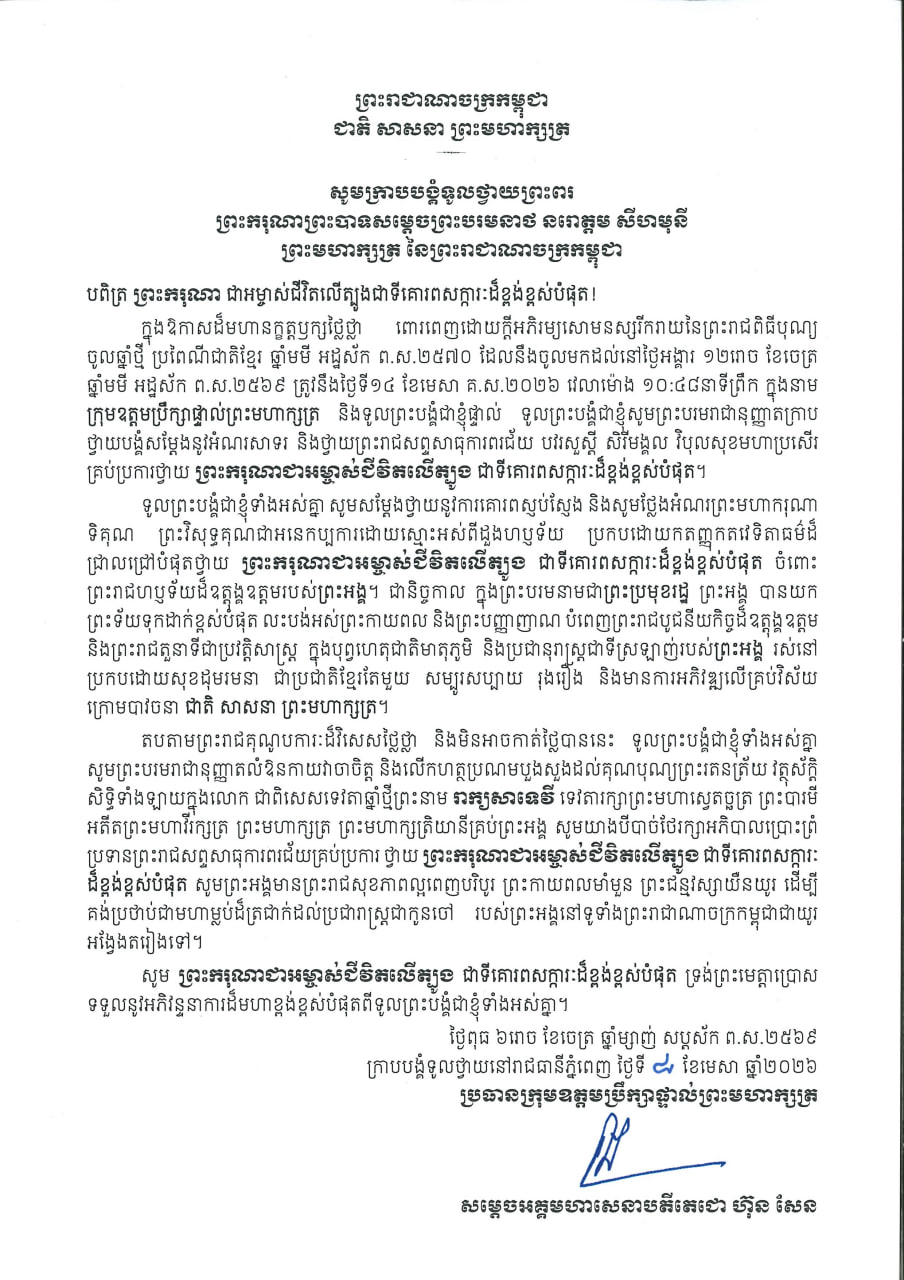 សម្តេចអគ្គមហាសេនាបតីតេជោ ហ៊ុន សែន ប្រមុខរដ្ឋស្តីទីនៃព្រះរាជាណាចក្រកម្ពុជា និងជាប្រធានក្រុមឧត្តមប្រឹក្សាផ្ទាល់ព្រះមហាក្សត្រ ក្រាបបង្គំទូលថ្វាយព្រះពរ ព្រះករុណា ព្រះបាទ សម្តេចព្រះបរមនាថ