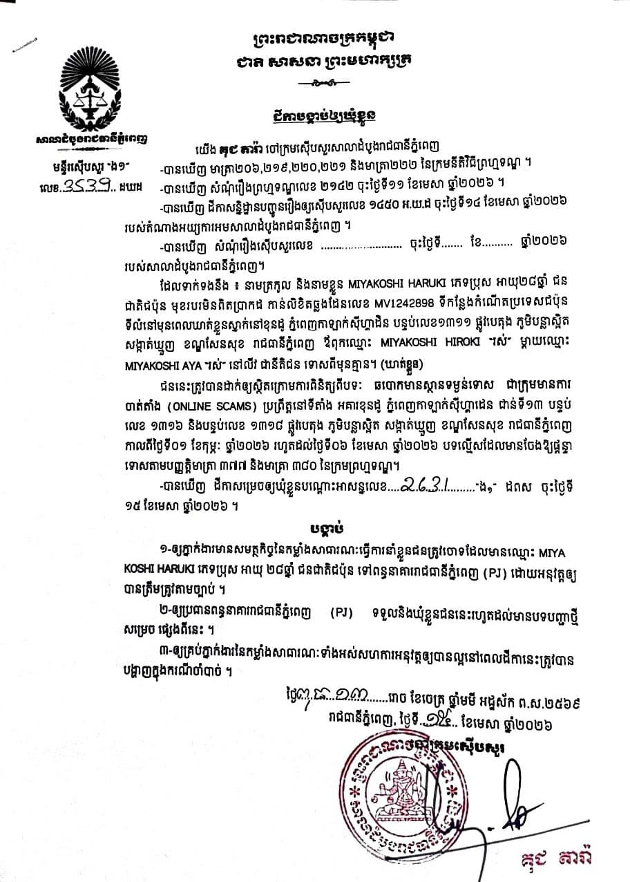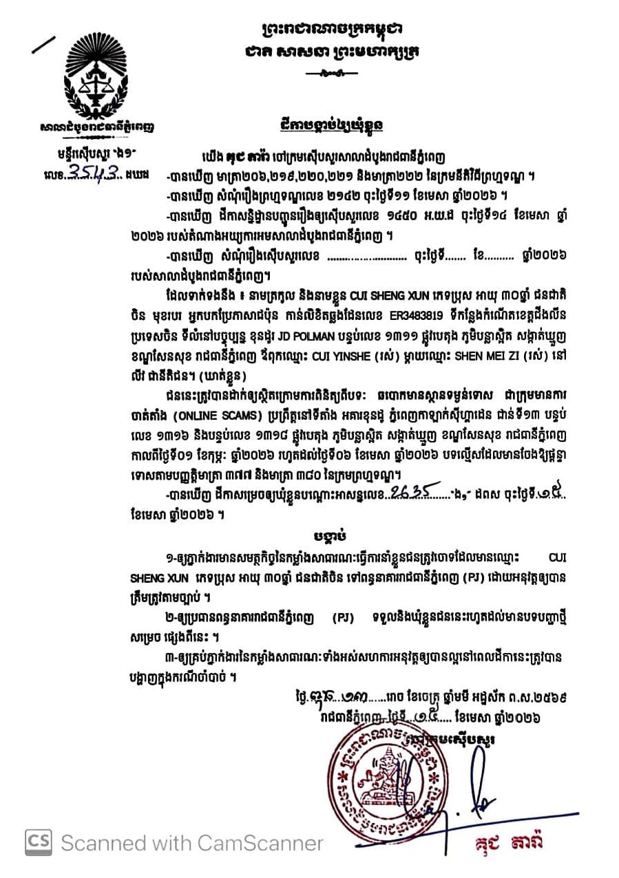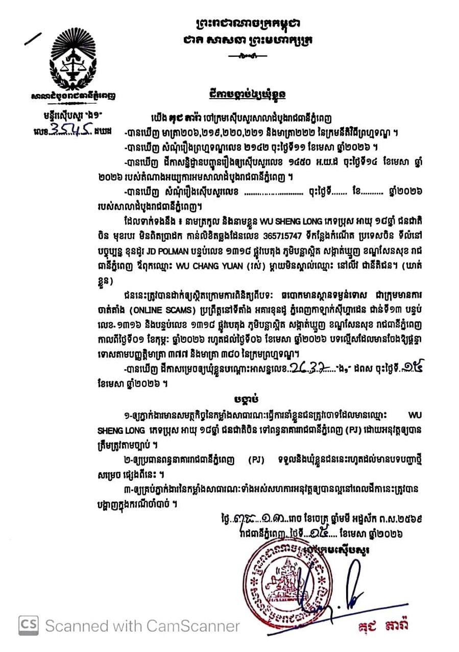(ភ្នំពេញ)៖ ចៅក្រមស៊ើបសួរសាលាដំបូងរាជធានីភ្នំពេញ នៅថ្ងៃទី១៥ ខែមេសា ឆ្នាំ២០២៦បានសម្រេចចោទប្រកាន់ជនត្រូវចោទជាចំនួន៨នាក់ ពីបទឆបោកមានស្ថានទម្ងន់ទោសជាក្រុមមានការចាត់តាំង Online Scam ទៅឃុំខ្លួននៅពន្ធនាគាររាជធានីភ្នំពេញ(PJ) ។