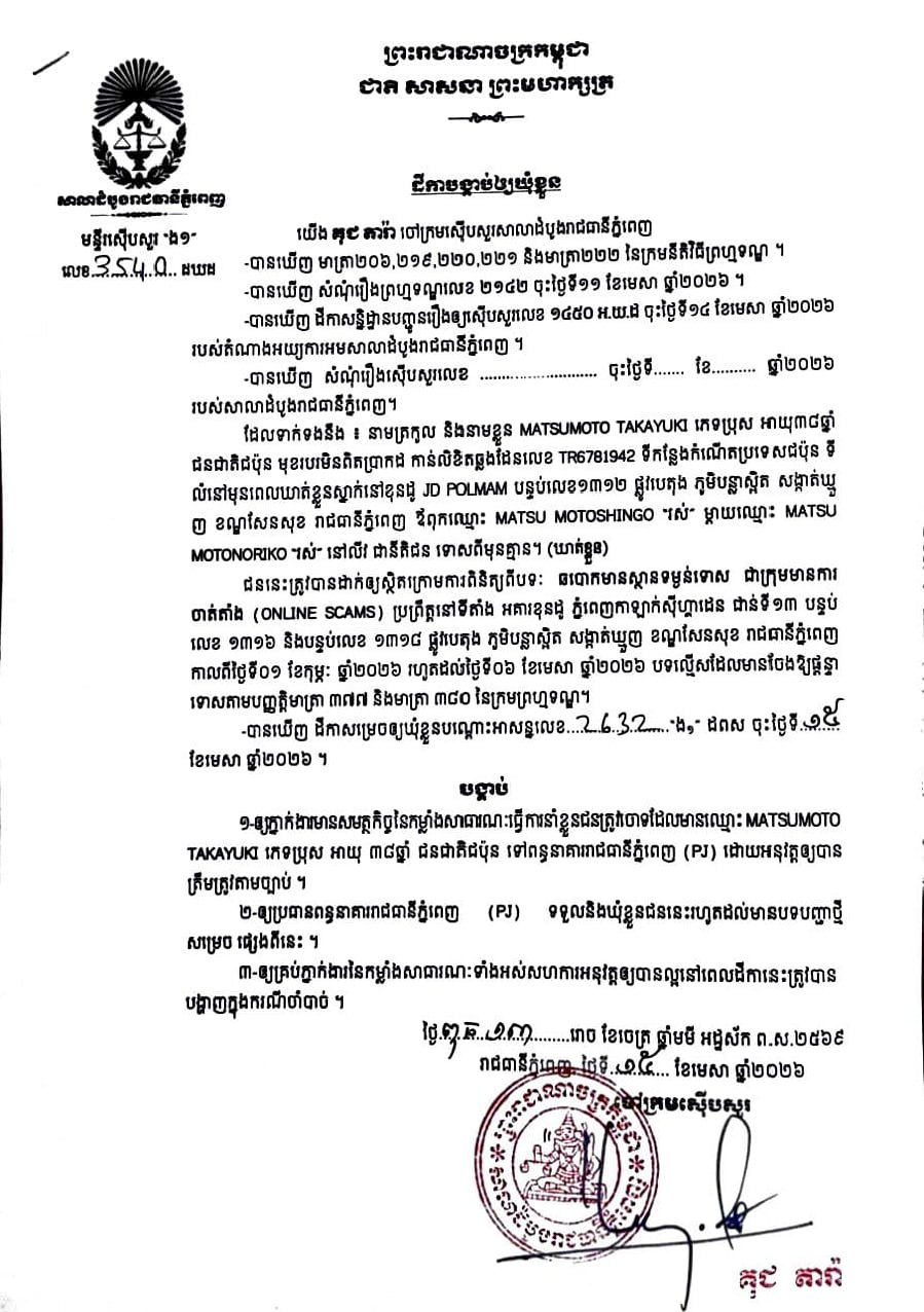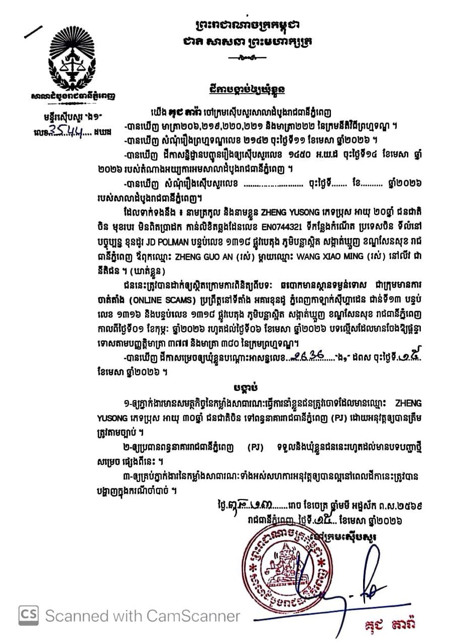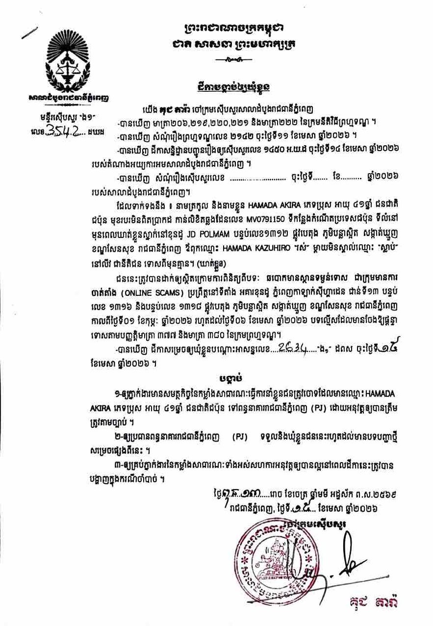 (ភ្នំពេញ)៖ ចៅក្រមស៊ើបសួរសាលាដំបូងរាជធានីភ្នំពេញ នៅថ្ងៃទី១៥ ខែមេសា ឆ្នាំ២០២៦បានសម្រេចចោទប្រកាន់ជនត្រូវចោទជាចំនួន៨នាក់ ពីបទឆបោកមានស្ថានទម្ងន់ទោសជាក្រុមមានការចាត់តាំង Online Scam ទៅឃុំខ្លួននៅពន្ធនាគាររាជធានីភ្នំពេញ(PJ) ។