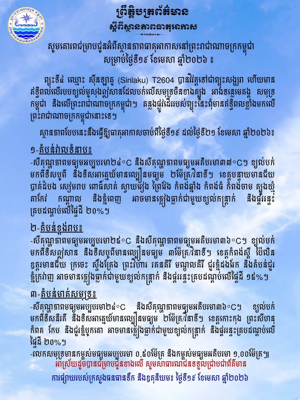 ក្រសួងធនធានទឹក ជូនដំណឹងអំពីស្ថានភាពធាតុអាកាសនៅកម្ពុជា សម្រាប់ថ្ងៃទី១៩ ខែមេសា ឆ្នាំ២០២៦