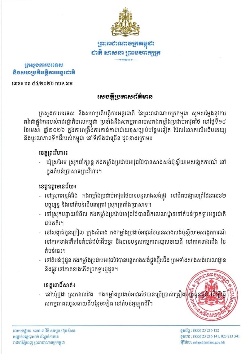 ភ្នំពេញ៖ ក្រសួងការបរទេស និងសហប្រតិបត្តិការអន្តរជាតិ នៃព្រះរាជាណាចក្រកម្ពុជា នៅថ្ងៃទី១៩ ខែមេសា ឆ្នាំ២០២៦នេះ បានប្រកាសការតវ៉ាជាផ្លូវការរបស់រាជរដ្ឋាភិបាលកម្ពុជាជាថ្មី ប្រឆាំងនឹងសកម្មភាពរបស់កងកម្លាំងប្រដាប់អាវុធថៃនៅថ្ងៃទី១៨ ខែមេសា ឆ្នាំ២០២៦ ក្នុងការពង្រឹងការកាន់កាប់ដោយខុសច្បាប់បន្ថែមទៀតដែលរំលោភលើអធិបតេយ្យ និងបូរណភាពទឹកដីរបស់កម្ពុជា នៅទីតាំងជាច្រើន។ នេះបើយោងតាមសេចក្តីប្រកាសព័ត៌។