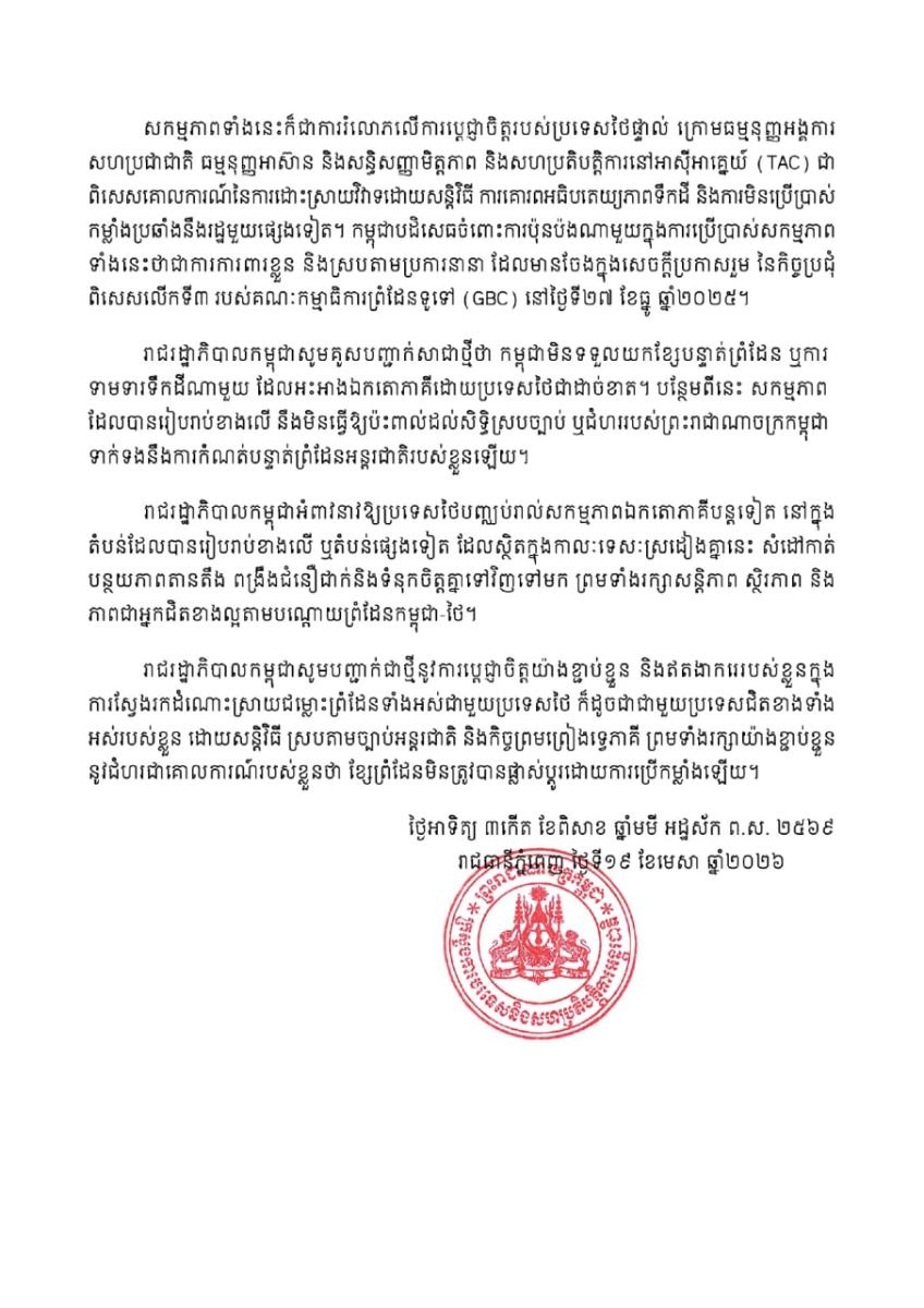រាជរដ្ឋាភិបាលកម្ពុជាគូសបញ្ជាក់សាជាថ្មីថា កម្ពុជាមិនទទួលយកខ្សែបន្ទាត់ព្រំដែន ឬការទាមទារទឹកដីណាមួយដែលអះអាងឯកតោភាគីដោយប្រទេសថៃជាដាច់ខាត។ បន្ថែមពីនេះ សកម្មភាព ដែលបានរៀបរាប់ខាងលើនឹងមិនធ្វើឱ្យប៉ះពាល់ដល់សិទ្ធិស្របច្បាប់ ឬជំហររបស់ព្រះរាជាណាចក្រកម្ពុជាទាក់ទងនឹងការកំណត់បន្ទាត់ព្រំដែនអន្តរជាតិរបស់ខ្លួនឡើយ។