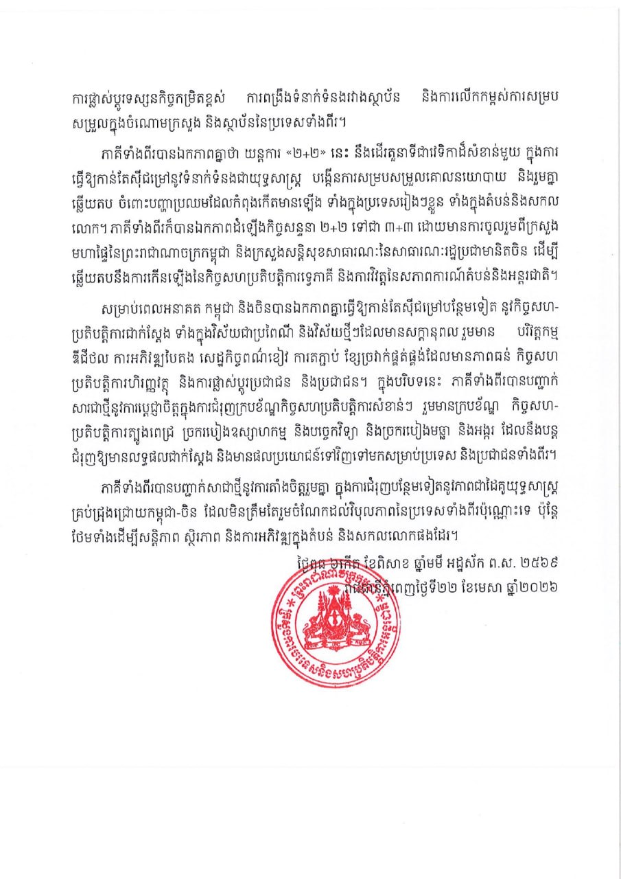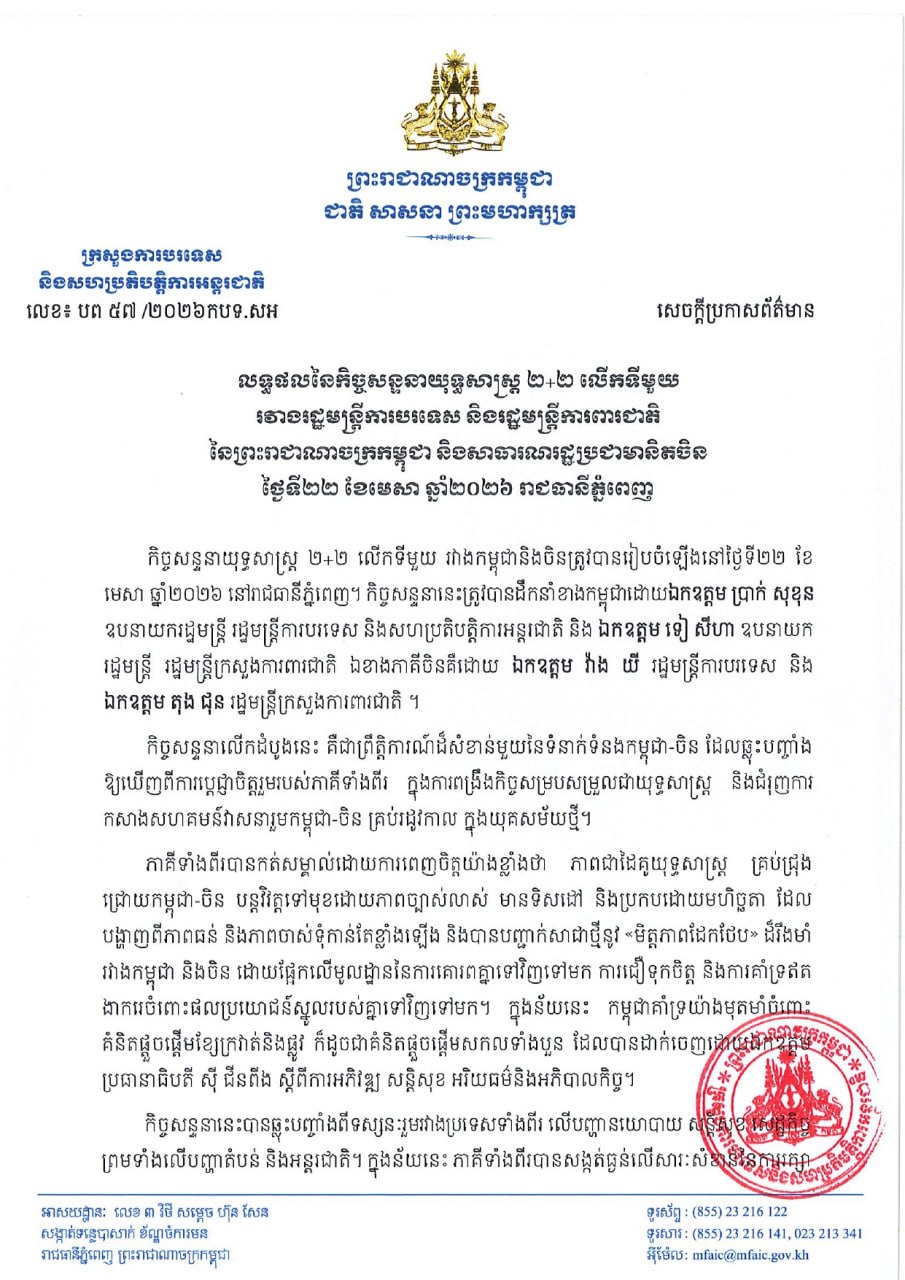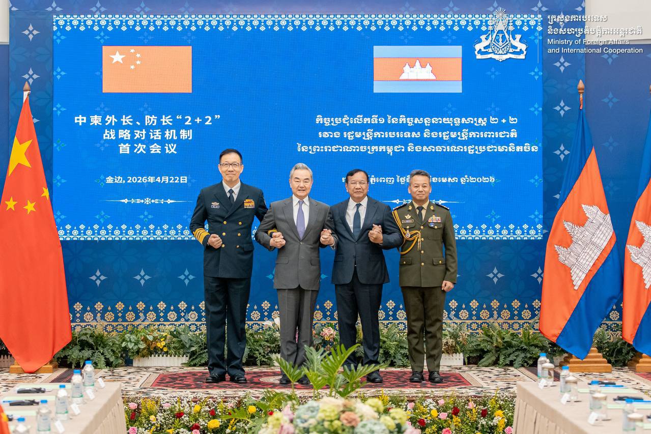 លទ្ធផលនៃកិច្ចសន្ទនាយុទ្ធសាស្ត្រ ២+២ លើកទីមួយ រវាងរដ្ឋមន្ត្រីការបរទេស និងរដ្ឋមន្ត្រីការពារជាតិ ព្រះរាជាណាចក្រកម្ពុជា និងសាធារណរដ្ឋប្រជាមានិតចិន ថ្ងៃទី២២ ខែមេសា ឆ្នាំ២០២៦ រាជធានីភ្នំពេញ