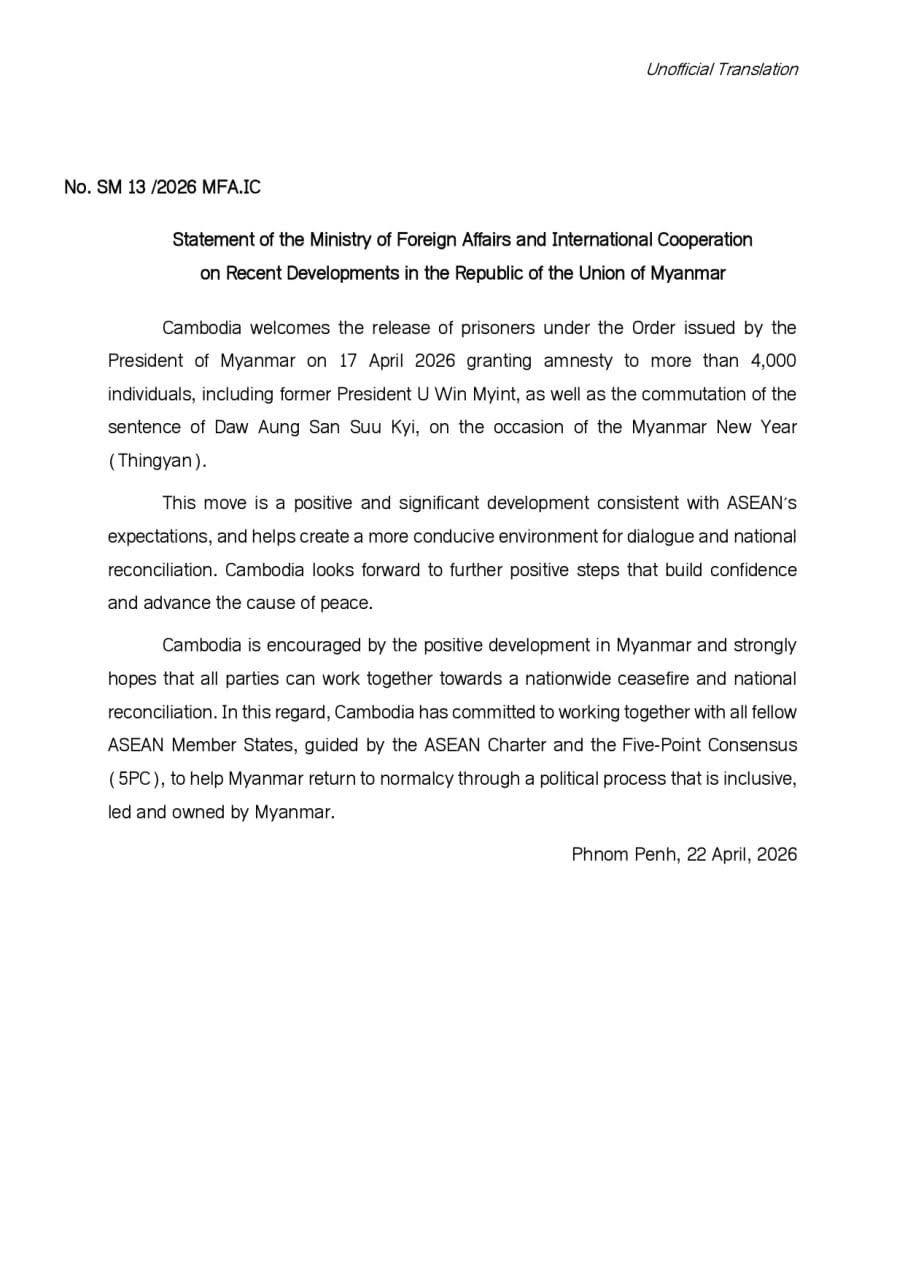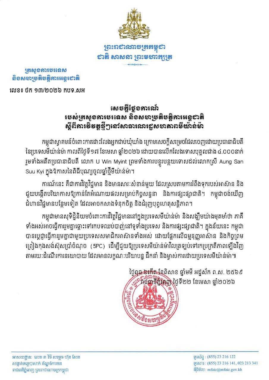 ក្រសួងការបរទេស ៖ កម្ពុជាស្វាគមន៍ចំពោះការដោះលែងអ្នកជាប់ឃុំឃាំងក្រោមសេចក្តីសម្រេចដែលចេញដោយប្រធានាធិបតីមីយ៉ាន់ម៉ា ដោយបានលើកលែងទោសបុគ្គលជាង ៤.០០០នាក់ រួមទាំងអតីតប្រធានាធិបតី លោក U Win Myint និងបន្ធូរបន្ថយទោសលោកស្រី Aung San Suu Kyi ក្នុងឱកាសនៃពិធីបុណ្យចូលឆ្នាំថ្មីមីយ៉ាន់ម៉ា៕