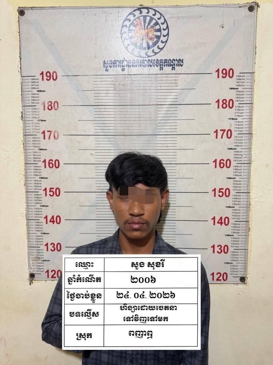 ២.ឈ្មោះ សួង សុខរី ភេទប្រុស អាយុ២០ឆ្នាំ ជនជាតិខ្មែរ មុខរបរ កម្មកររោងចក្រ មានទីលំនៅភូមិត្រពាំងព្រៃភូមិ ឃុំទំនប់ធំ ស្រុកពញាឮ ខេត្ដកណ្ដាល។ (ឃាត់ខ្លួន)
