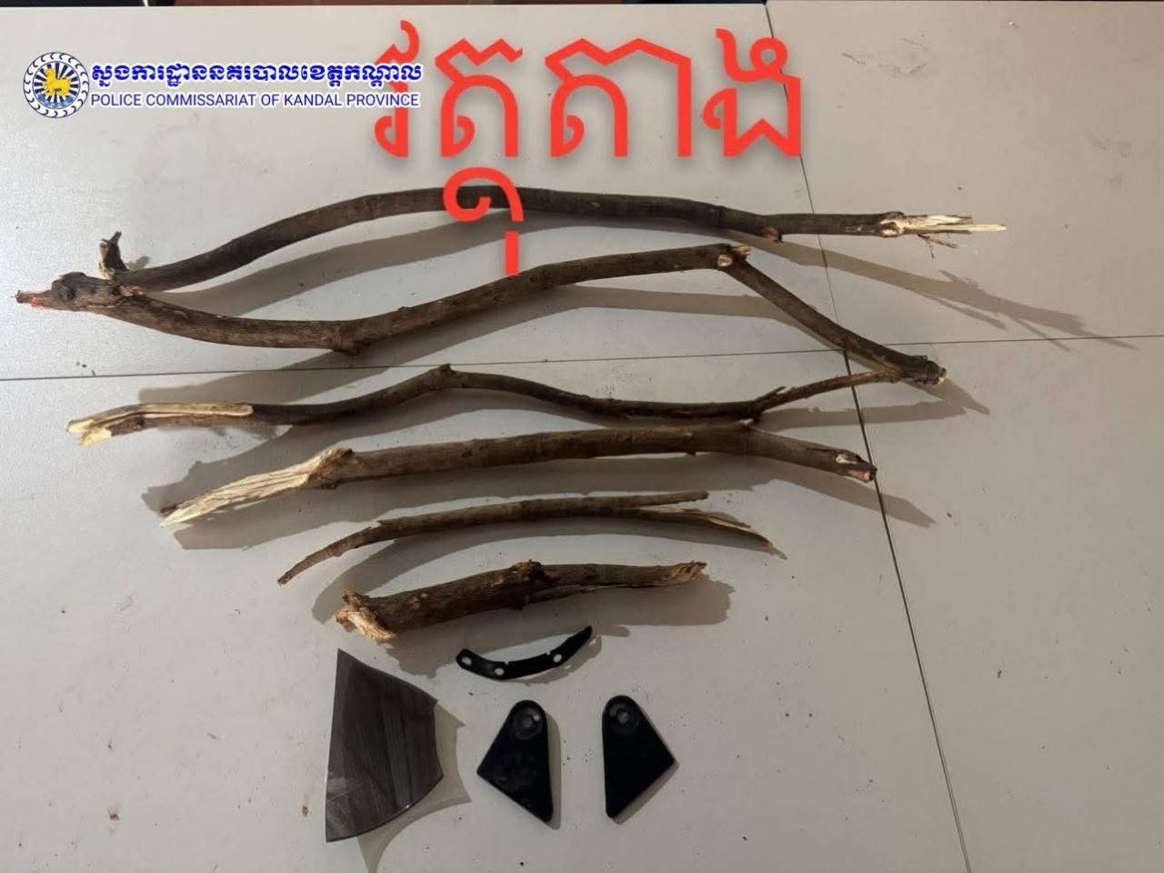 -កំណាត់ឈើមែកស្វាយ ចំនួន០៦កំណាត់ (បន្សល់ទុកនៅកន្លែងកើតហេតុ)។