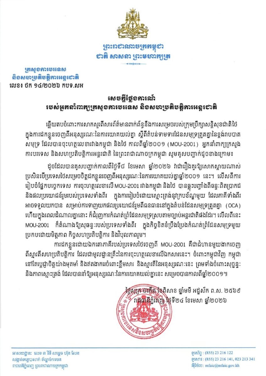 ឆ្លើយតបចំពោះការសាកសួរពីសារព័ត៌មានពាក់ព័ន្ធនឹងការសម្រេចរបស់ក្រុមប្រឹក្សាសន្តិសុខជាតិថៃ ក្នុងការដកខ្លួនចេញពីអនុស្សរណៈនៃការយោគយល់គ្នា ស្តីពីតំបន់ទាមទារដែនសមុទ្រត្រួតគ្នានៃខ្ពង់រាបបាត សមុទ្រ ដែលបានចុះហត្ថលេខារវាងកម្ពុជា និងថៃ កាលពីឆ្នាំ២០០១ (MOU-2001) អ្នកនាំពាក្យក្រសួង ការបរទេស និងសហប្រតិបត្តិការអន្តរជាតិ នៃព្រះរាជាណាចក្រកម្ពុជា គូសបញ្ជាក់ថា៖