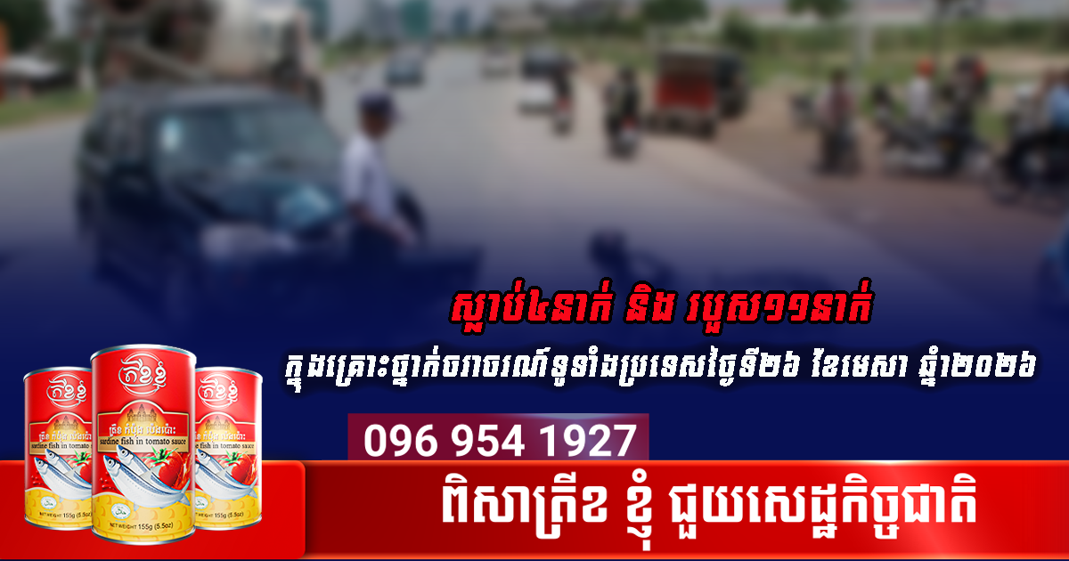 ស្លាប់៤នាក់ និងរបួស១១នាក់ ក្នុងគ្រោះថ្នាក់ចរាចរណ៍ទូទាំងប្រទេសថ្ងៃទី២៦ ខែមេសា ឆ្នំា២០២៦