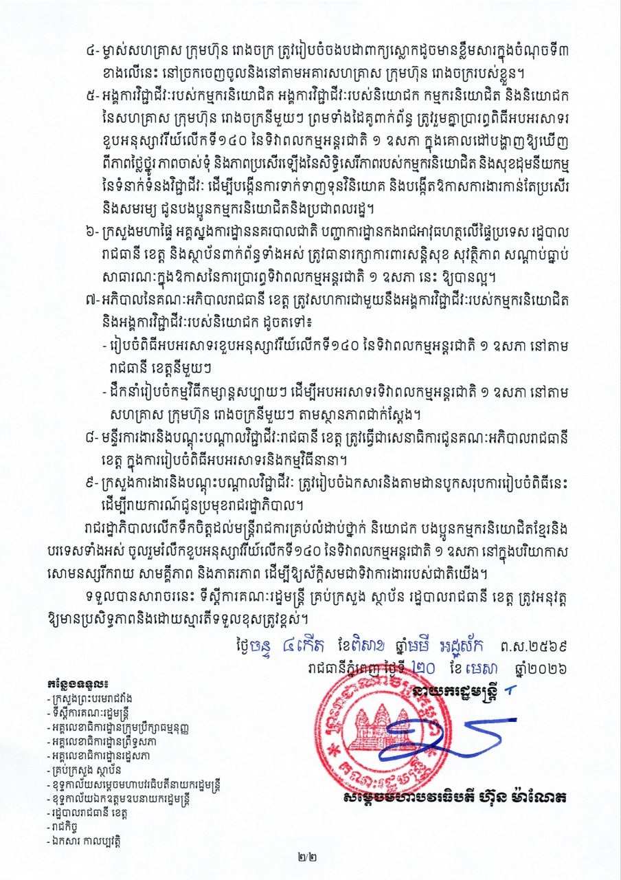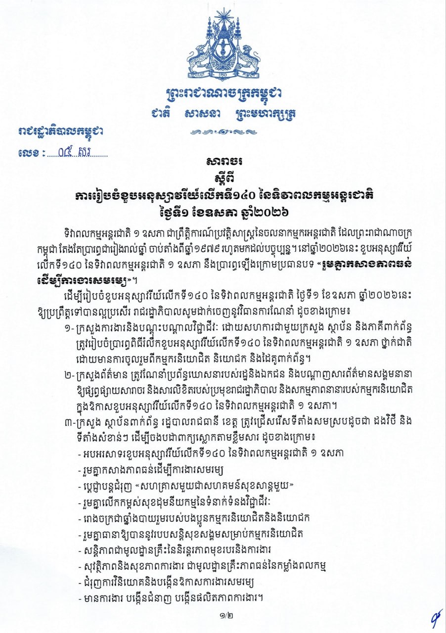 សម្តេចមហាបវរធិបតី ហ៊ុន ម៉ាណែត នាយករដ្ឋមន្ត្រីនៃព្រះរាជាណាចក្រកម្ពុជា សារាចរ ស្តីពី ការរៀបចំខួបអនុស្សាវរីយ៍លើកទី១៤០ នៃទិវាពលកម្មអន្តរជាតិ ថ្ងៃទី១ ខែឧសភា ឆ្នាំ២០២៦ ៕