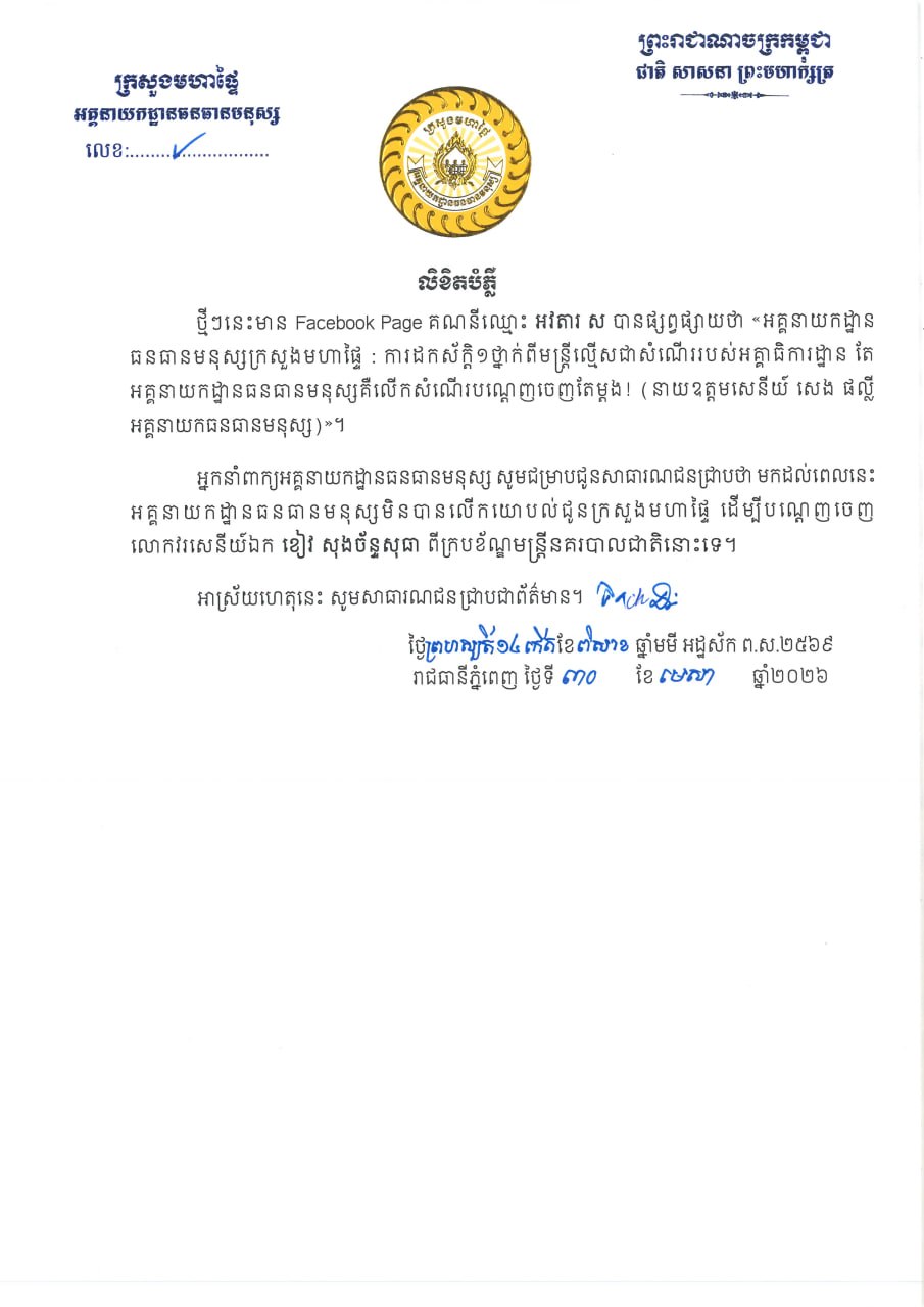 ក្រសួងមហាផ្ទៃ បានបញ្ជាក់ថា មិនមានការស្នើបណ្តេញមន្ត្រីនគរបាលជក់បារីអេឡិចត្រូនិកពីក្របខណ្ឌនោះទេ។
