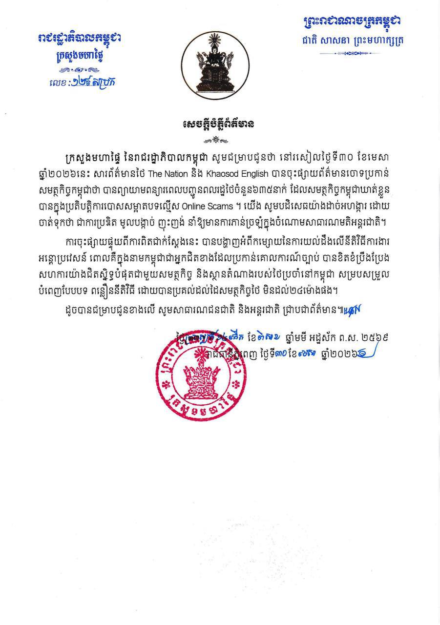 សេចក្តីបំភ្លឺព័ត៌មាន របស់ ក្រសួងមហាផ្ទៃ នៃរាជរដ្ឋាភិបាលកម្ពុជា ដោយបដិសេធយ៉ាងដាច់អហង្ការពាក់ព័ន្ធនឹងសារព័ត៌មានថៃ The Nation និង Khaosod English បានចុះផ្សាយព័ត៌មានចោទប្រកាន់សមត្ថកិច្ចកម្ពុជាថាបានព្យាយាមពន្យារពេលបញ្ជូនពលរដ្ឋថៃចំនួន ៦៣៥នាក់ ដែលសមត្ថកិច្ចកម្ពុជាឃាត់ខ្លួនបានក្នុងប្រតិបត្តិការបោសសម្អាតបទល្មើស Online Scams